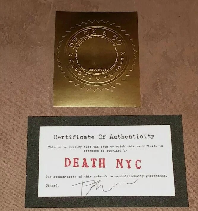 我可以寄到中国。给我发消息,我会将清单从印刷品更改为绘画,然后可以运送到中国。 Wǒ kěyǐ jì dào zhōngguó. Gěi wǒ fā xiāoxī, wǒ huì jiāng qīngdān cóng yìnshuāpǐn gēnggǎi wèi huìhuà, ránhòu kěyǐ yùnsòng dào zhōngguó Item can be shipped to China. Message me so i can change the listing category from a print to a painting. Death NYC Print is Brand New 100% Authentic Size: 45cm x 32cm (large) Edition of 100 and Artists Proofs (of which there are approx 20-30) This print is an Artists Proof (AP) The art print is signed and dated by DEATH NYC Paper: Fine art 300 gsm paper Print is Blind Stamped and Comes With Certificate of Authenticity Card signed by DEATH NYC And Gold Seal Sticker