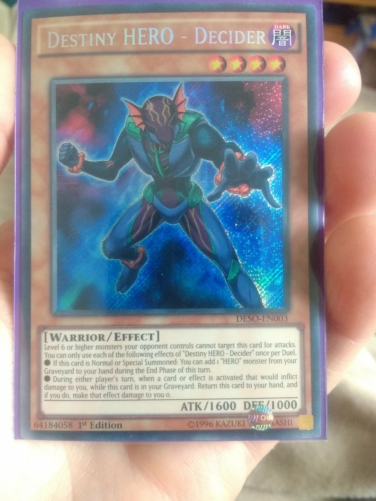 DESO-EN003 DESTINY HERO- DECIDER Secret Rare 1st Edition YuGiOh Card. Condition is New. Dispatched with Royal Mail 2nd Class Letter. Condition is new/mint. I will send the card in a card sleeve and pack it well to avoid damage.