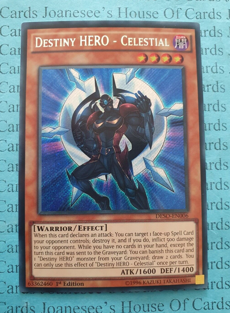 This is the Secret Rare Foil Dark Warrior Destiny HERO - Celestial DESO-EN006 1st Edition English Near Mint Condition (Unplayed, minor storage wear to rear only) Totally Original Konami (or your money back!) I will deliver in safe packaging to keep it in perfect condition. Ideal for players and collectors alike. Check out my other items! I will combine postage costs for multiple purchases. Sign up for my email newsletters by adding my eBay Shop to your favourites