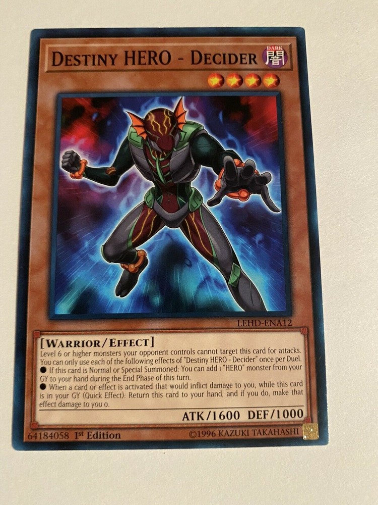You are bidding on : 1 x Yu-Gi-Oh Legendary Hero Decks - Destiny HERO Deck DESTINY HERO - DECIDER (Common - 1st Edition) LEHD-ENA12 All cards are in Near Mint condition unless specified Pictures are stock pictures ONLY it is not of the actual card How we identify the condition of the card: Near Mint: Most of the time cards in this condition are pack fresh but, the card may have minor flaws that are not visible with a quick inspection, small white dots or scratches that you have to closely examine the card to see. Excellent: Overall the card looks near mint but may have minor scratches, slightly worn edges that are visible but they do not interfere with the way the card looks. Lightly Played: Similar to a card in excellent condition except there is more whitening around the edges and the corners are a little more worn or slight bends or creases that are visible. There might be some slight whitening on the back or front of the card. Imperfections will be visible with a quick inspection. When the card is sleeved the imperfections will not be noticeable and the card will look just like the rest of your cards Played: There is a large amount of whitening around the edges and the corners have a good amount of damage, many scratches, bends and/or creases on the card. When the card is sleeved it can still be played Shipping and Handling : Canada Shipping is $1.50 CAD Tracking is offered for $13 CAD BUT tracking is required on any purchases that are over $50 CAD Please contact us for combined shipping if interested in purchasing multiple cards before paying USA Shipping is $1.99 CAD Regular Mail for all orders under $19.99 Shipping is $7.99 CAD with tracking for all orders $19.99 and over Please contact us for combined shipping if interested in purchasing multiple cards before paying INTERNATIONAL Shipping is $4.99 CAD with regular mail Tracking is offered for $29.99 CAD BUT tracking is required for purchases over $50 CAD Please contact us for combined shipping if interested in purchasing multiple cards before you pay Combined shipping: We offer combined shipping: each and every additional item after the first one is only $0.25 (25 cents). To obtain combined shipping fees, please use the shopping cart or ask for the combined shipping invoice BEFORE you pay. If you pay item-by-item, right away after the purchase, we will not be able to offer you combined shipping anymore. Handling Your order will be shipped 1-3 business days after payment has been received *“Business days” are normal weekdays. Saturdays, Sundays, and major holidays do not count as business days. Cards purchased are packaged and shipped in a sleeve, toploaders, a team bag and an envelope to ensure protection of cards Payment : We accept payment via PayPal only. Payments should be made within 5 days after purchase Epic Cards and Games Any questions feel free to email us and allow 1 day for a response. Thanks for looking! Sales Tax (Canada Only) : Purchases made by Canadian residents are subject to applicable GST/HST, depending on your province/territory. (If you do not agree to this, please do not bid. We have a registered business in Canada and are required by law to charge taxes to anything shipped within the country.) Thank you for shopping with Epic Cards and Games