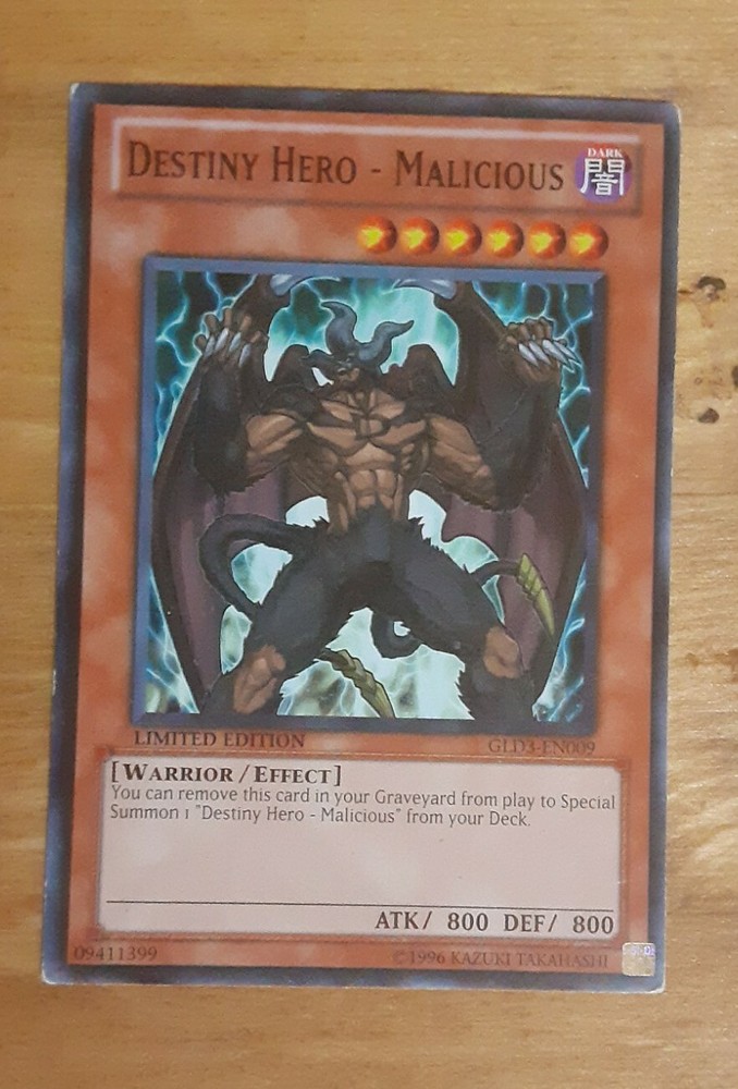 DESTINY HERO - MALICIOUS - Common - GLD3-EN009 - Limited - NM - Yu-Gi-Oh. Condition is moderately played this card is not in perfect condition feel free to ask more pictures to be sure on what you are bidding. *no refunds*