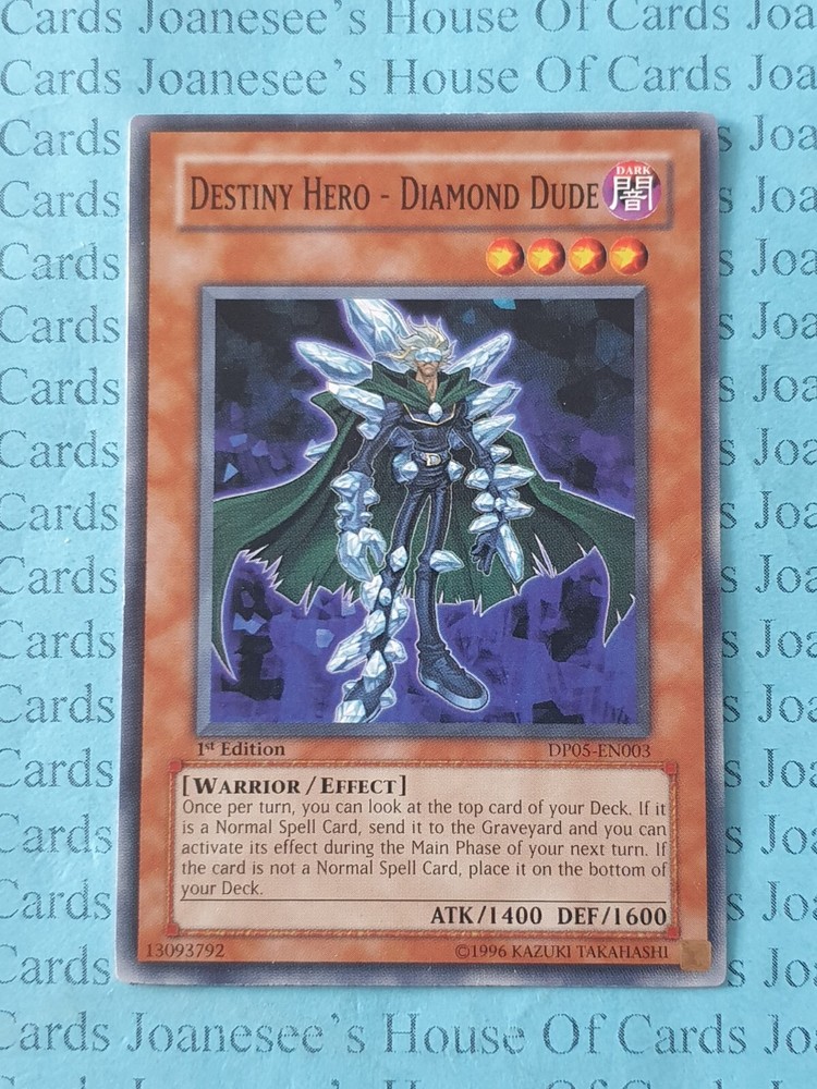 This is the Common Dark Warrior Destiny HERO - Diamond Dude DP05-EN003 1st Edition English Mint/NMint Condition Totally Original Konami (or your money back!) I will deliver in safe packaging to keep it in perfect condition. Ideal for players and collectors alike. Check out my other items! I will combine postage costs for multiple purchases. Sign up for my email newsletters by adding my eBay Shop to your favourites
