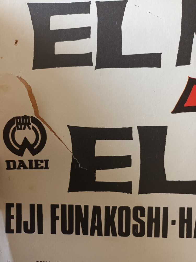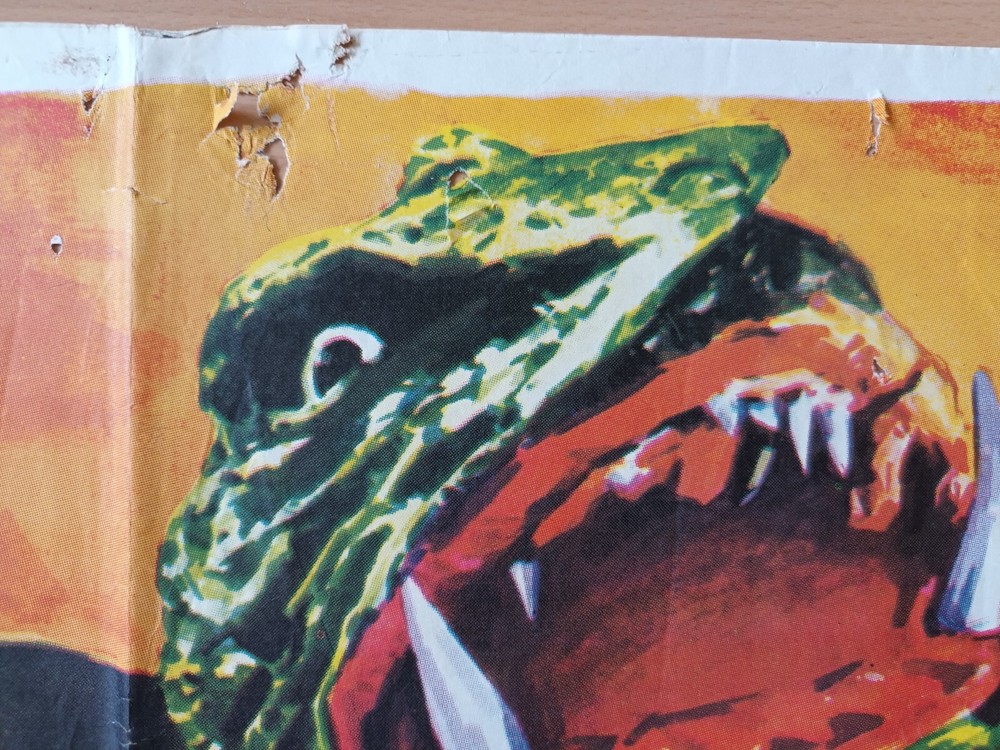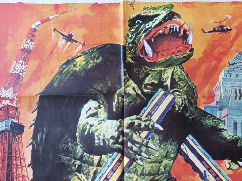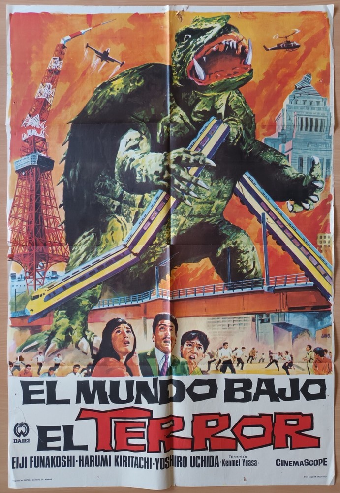 Daikaiju Gamera aka:Gamera (1965) Directed by Noriaki Yuasa Description: Original Spanish 1967 Poster Condition: Good. Large tear near the bottom left corner. Edge small tears, rips and wear. Folded as issued Poster Year: 1967 [Spanish 1st Release] Size: 39" x 27" (100 x 70 cm) Approx. Comments: Original and Rare Spanish Poster with giant turtle rampaging over city art by Jano Condition grading: All photos displayed are of the actual item for sale. For additional photos or information on the condition of any item, please email us at Mint A never used poster. May show minor signs of age and wear at folds due to storage. No holes, no tears. Near Mint A generally unused poster with fresh, saturated colors. May have minimal tears at folds. Has no significant holes, no paper loss, may have minor tears along edges, may have fine pin holes. Fine A poster with bright colors, clean, with general signs of use. May have minor tears at folds with minor paper loss, may have fine pin holes. May have restoration. Good An average poster with overall fresh color. May have tears, minor paper loss, minor hazing. Paper may be brittle due to age, may have minor stains. May have a small amount of writing in an unobtrusive place. May have medium or major restoration . Fair A poster with faded colors and brittle paper, showing significant signs of use. May have tears and paper loss. May have tape, writing, stains in image area. In need of restoration or had major restoration. Poor A poster that is worn, torn, and/ or damaged. May have staining, cracking, dry rot, and/or large tears. May be heavily soiled, may have pieces missing. In need of major restoration.