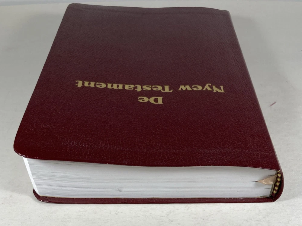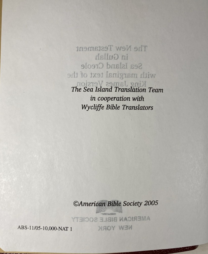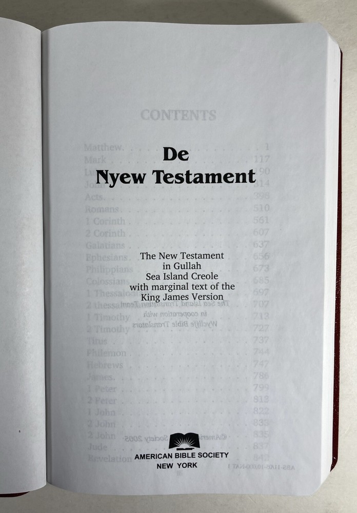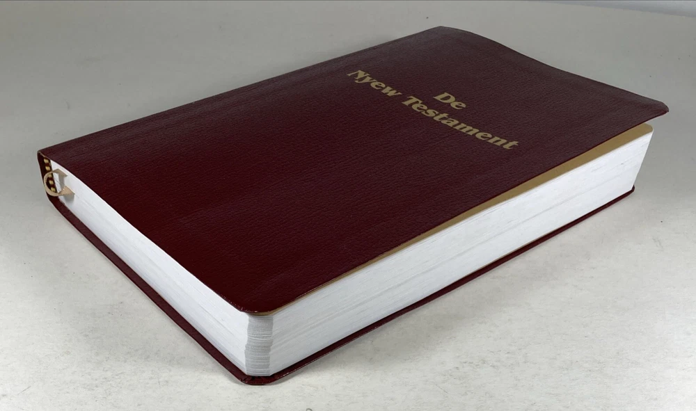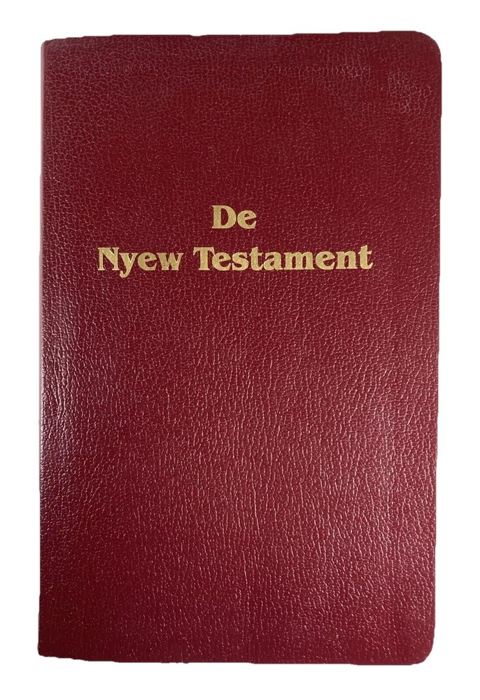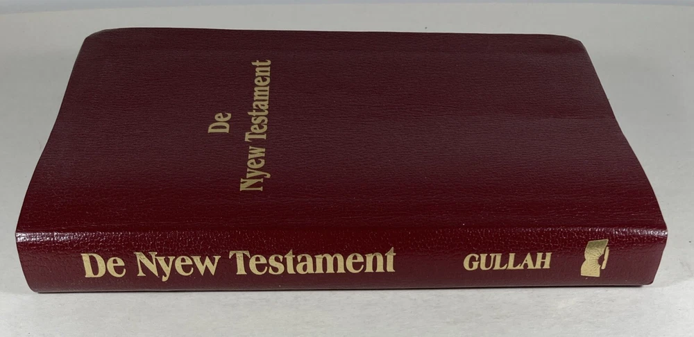 De Nyew Testament, King James Version (KJV) in Gullah Sea Island Creole, American Bible Society, Burgundy faux leather cover and ribbon book mark. Bible is in very good condition - almost like new. Covers and spines are fully attached with light handling wear to the covers. Gilt lettering on covers and spine is very good. Slight crease to the front cover. Pages are clean; no writing found inside. Ribbon book mark is slightly frayed at the bottom. Small scuff to the top edge of the book. See photos. Shipped with USPS Media Mail.