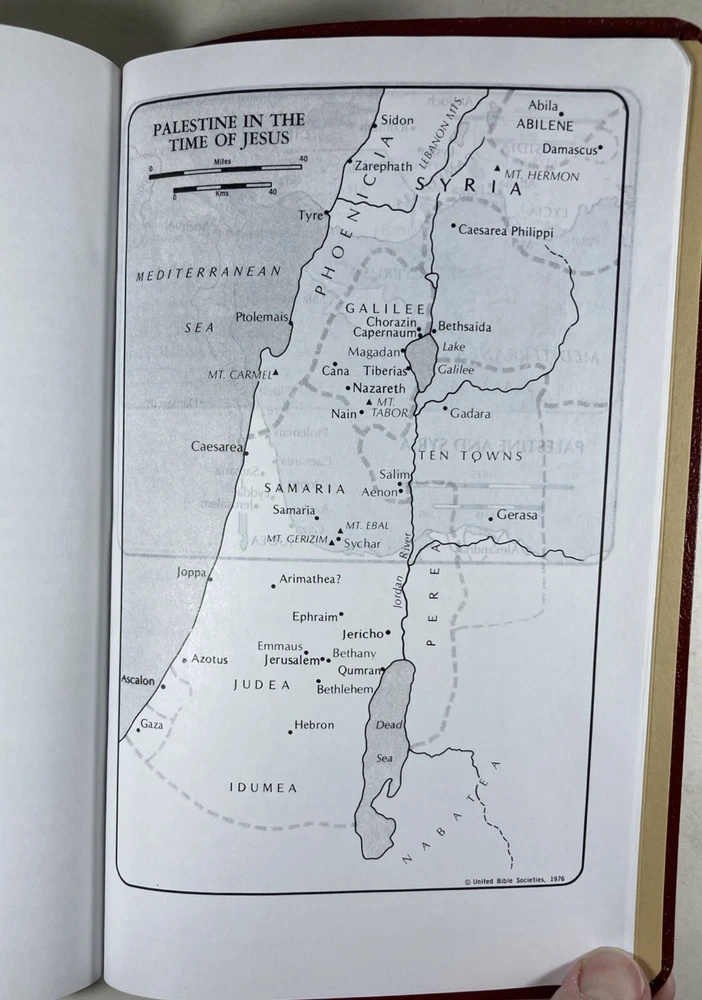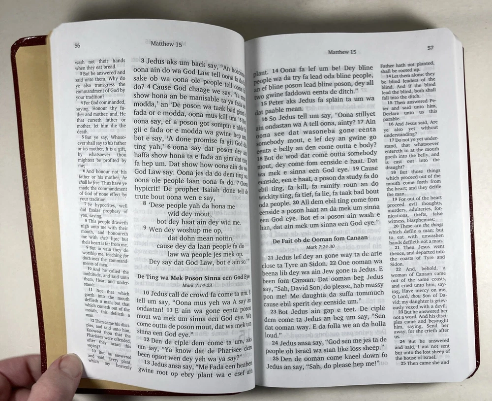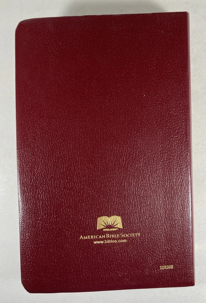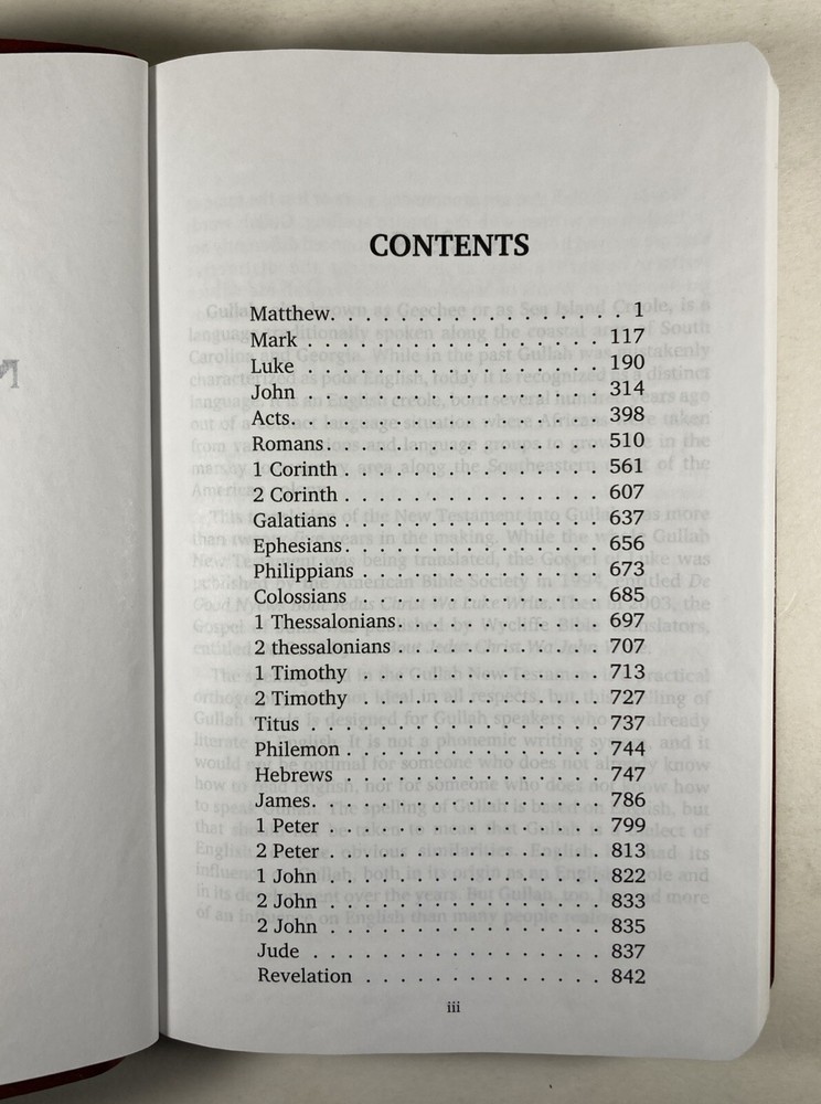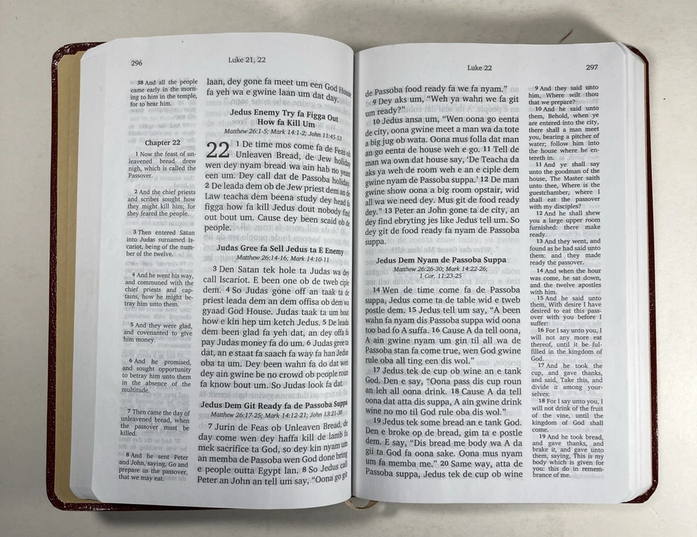 De Nyew Testament, King James Version (KJV) in Gullah Sea Island Creole, American Bible Society, Burgundy faux leather cover and ribbon book mark. Bible is in very good condition - almost like new. Covers and spines are fully attached with light handling wear to the covers. Gilt lettering on covers and spine is very good. Slight crease to the front cover. Pages are clean; no writing found inside. Ribbon book mark is slightly frayed at the bottom. Small scuff to the top edge of the book. See photos. Shipped with USPS Media Mail.
