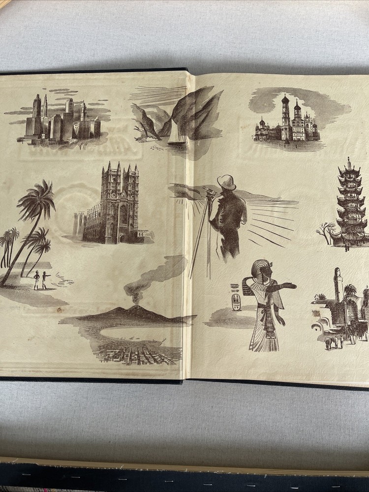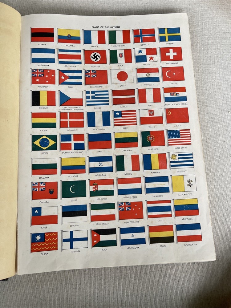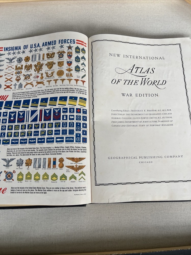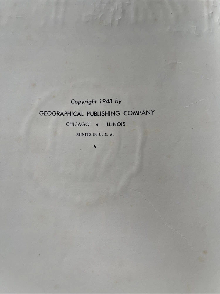 This is a Deluxe 1943 War Edition of the New International Atlas of the World. It is a hardcover book with a leather binding. The book is written in English and is illustrated with maps and other images. The book is an original copy published by Geographical Publishing Company. The book is categorized as an atlas, specifically a reference book on geography.