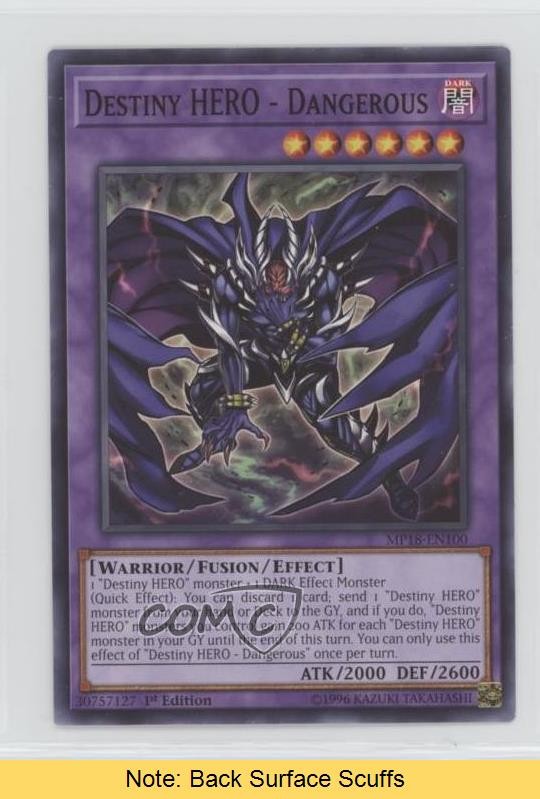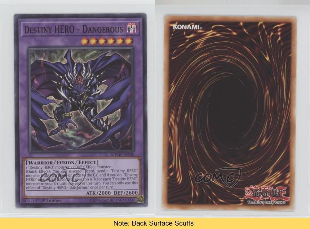2018 Yu-Gi-Oh! Mega-Tins - Mega Pack [Base] - 1st Edition #MP18-EN100 Destiny HERO - Dangerous COMC Item: 103619191 CONDITION NOTE: Back Surface Scuffs - YuGiOh Card Search for more: 2018 Yu-Gi-Oh! Mega-Tins Search for more: 2018 Yu-Gi-Oh! Mega-Tins - Mega Pack [Base] - 1st Edition View all of our Listings Auctions Buy It Now About Us Located in the beautiful Pacific Northwest, COMC (Check Out My Cards) is the world's largest consignment service for trading card singles. More than 10,000 people have used our consignment service to list over 50 million trading cards. Find out how we can help you consign your items on eBay by contacting us through eBay messaging. COMC -- "The Safe & Easy Way to Buy & Sell" Raw Condition for Modern Cards Unless otherwise noted, raw modern cards are listed in Near Mint-Mint condition or better. A NM-MT card appears to be Mint at first glance, but upon closer inspection, may exhibit some of the following: minor print defects (e.g. roller marks, print line, dimple), minor scratches, slight edge wear, and slight corner wear. Centering is clearly visible in the images provided and does not factor into our condition assessment. Raw Condition for Vintage Cards Unless otherwise noted, raw vintage cards are listed in Excellent condition or better. An EX card may exhibit some of the following: minor rounding of corners, surface wear, print defects, light scratches, and slight edge wear/chipping. Centering is clearly visible in the images provided and does not factor into our condition assessment. Domestic Shipping Combined shipping for multiple items is available. To receive combined shipping, please ensure all desired items are in your eBay shopping cart before proceeding to checkout. eBay limits orders to 40 items per order. We automatically combine multiple orders placed on the same day. If you place multiple orders on the same day, please contact us to request a refund of applicable shipping costs. Signature confirmation may be required on invoices over $400. All cards are protected and shipped securely. International Shipping COMC offers eBay's International Shipping (EIS) for international orders under $2,500* (see country exceptions below). All duties and import fees are paid at checkout; in the rare event that there are additional import fees upon delivery, these are borne by the buyer. EIS packages route through a shipping hub in Erlanger, KY before shipping to their final destination. Please note that EIS does not allow for combined shipments. The shipping rates are determined by eBay and cannot be adjusted. *Maximum sale price exceptions: Colombia, Kuwait ($2,000); Taiwan ($1,539); Chile, Costa Rica, Guatemala, Honduras, Trinidad and Tobago ($1,000); Antigua and Barbuda, Aruba, Belize, Dominica, Grenada, Philippines, Saint Kitts and Nevis, Saint Lucia, Montserrat, Turks and Caicos Islands ($500); Dominican Republic, El Salvador ($200). Please request a shipping quote through eBay messaging for orders that exceed the maximum sale price supported by eBay's International Shipping. You will be responsible for all duties and import fees for international orders shipped outside the EIS. All cards are protected and shipped securely. Payment COMC does not accept offers on our cards through our eBay storefront. COMC utilizes eBay’s managed payments system. If you are experiencing difficulties making a payment, please contact eBay for assistance. Return Policy Returns are only accepted on the rare occasion the item is not as described. If you are making a return, please initiate the return process through eBay so a mailing label can be provided for you. Prior to listing, our expert team carefully assessed this item to represent it accurately. Please review the description and high-definition images prior to purchasing to ensure this item meets your satisfaction. We welcome you to contact us if you have further questions about this item. Trust and Integrity COMC carefully assesses each item consigned to us to prevent fraudulent items from entering the marketplace. If you believe an item offered on COMC may be fraudulent, please contact us with details so we can investigate the issue. Items we determine are outside our supported items policy may be removed. Last Modified: 6/3/2025 10:49:28 AM PDT
