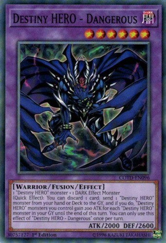 Please, carefully read the following: Image shown is a stock photo and does not reflect the actual card you will be receiving. Please refer to the condition guide below, the title and item description for what you will be receiving. Please also be aware that due to plastic shortages, orders may not always come in a plastic toploader but will always be protected as much as possible to prevent damage. You will receive 3x Destiny HERO - Dangerous - COTD-EN096 - Common - 1st Edition - Condition: Near Mint Please refer to the Title and Item Description above for the item being purchased. Delivery delays: Deliveries may not always fall within the estimated delivery dates when shipping outside of Canada and USA. Many factors may contribute to delays in delivering the package such as weather and customs. Please note that delivery to international locations may take up to 8 weeks to arrive . We always ship out orders within 1 business day and after dropping off with the post office, delivery times are out of our control. Feedback: We will always leave positive feedback for you and we ask if you can do the same for us. If there is any reason why the transaction was not up to your expectations, please message us before leaving feedback so we can address the issue. Combined shipping: To receive a combined shipping quote, please make sure that you commit to purchasing on ebay.ca . This allows us to send you a combined shipping invoice before payment. Shipping within the USA (6-10 Business days): FREE! Shipping within Canada (3-8 Business days): FREE! Shipping and handling delay: We aim to ship all orders within 1 business day. We do not ship on weekends and holidays. Condition Guide: We do not sell any cards that are in MINT condition, the best condition that we offer is near mint. Near Mint (NM) - Cards in Near Mint condition show minimal to no wear from shuffling, play or handling and can have a nearly unmarked surface, crisp corners and unblemished edges outside of a few minimal flaws. A Near Mint card may have a tiny edge nick or a tiny scratch or two, but overall look nearly unplayed with no major defects or flaws. Lightly Played (LP) - Cards in Lightly Played condition may have minor border or corner wear or even just slight scuffs or scratches. There are no major defects such as water damage, bends or issues with the structural integrity of the card. Noticeable imperfections are okay, but none should be too severe or at too high a volume. Moderately Played (MP) - Cards in Moderately Played condition exhibit condition issues visible at a casual glance. Cards in Moderately Played condition can have border wear, corner wear, scratching or scuffing, creases or whitening, minor dirt buildup or any combination of mild examples of these marks. A Moderately Played card may have some form of a more major marking, such as spot water damage or creasing that doesnʼt affect card integrity, but not in combination with other issues such as scratches, scuffs or border/edge wear and not impacting a large area of the card. Heavily Played (HP) - Cards in Heavily Played condition show a severe amount of wear. Heavily Played condition can include cards that have major creasing, major whitening, major border wear or any combination of those flaws. (These flaws cannot prevent the card from being tournament playable when sleeved.) Damaged - Cards in Damaged condition can exhibit a tear, bend or crease that may make the card illegal for tournament play, even in a sleeve. Cards in Damaged condition may have extreme border wear, extreme corner wear, heavy scratching or scuffing, folds, creases or tears or other damages that impacts the structural integrity of the card.