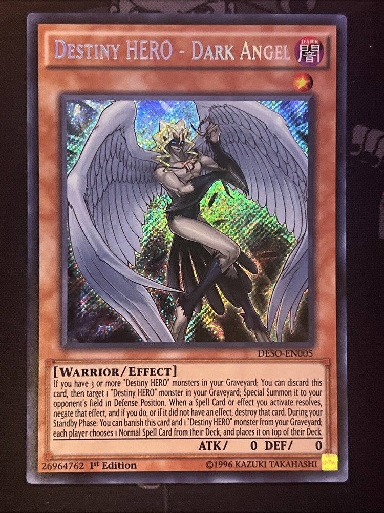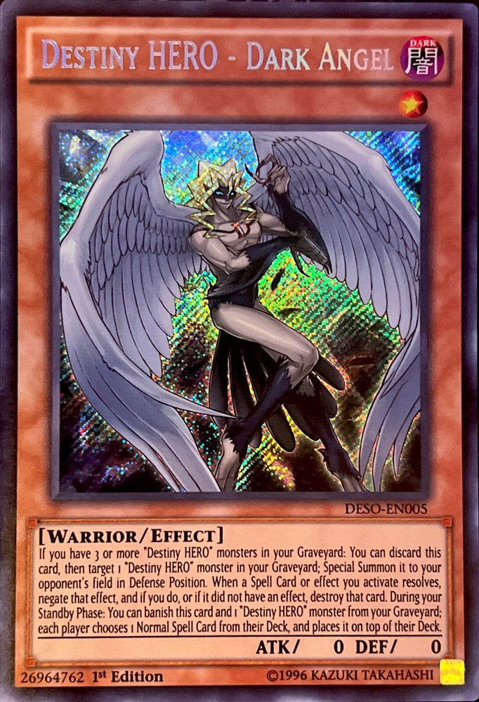 The product is a "Destiny HERO - Dark Angel" card from the "Destiny Soldiers" set in the Yu-Gi-Oh! TCG. This Secret Rare card features an Angel character with the Warrior creature type and Dark attribute. It is an Effect card with 0 Attack/Power and 0 Defense/Toughness, and it is part of the 1st Edition release. The card number is DESO-EN005, and it is manufactured by Konami in English language.