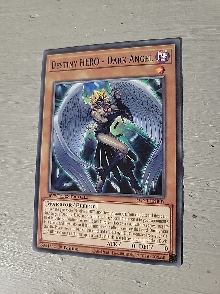 Introducing the Destiny HERO - Dark Angel SGX1-ENB09 card from the Yu-Gi-Oh! Trading Card Game. This card features the color Darkness and is a common rarity. It is a 1st edition Dark Angel card in regular finish. This card is a must-have for any Yu-Gi-Oh! collector and is perfect for adding to your collection of CCG individual cards.