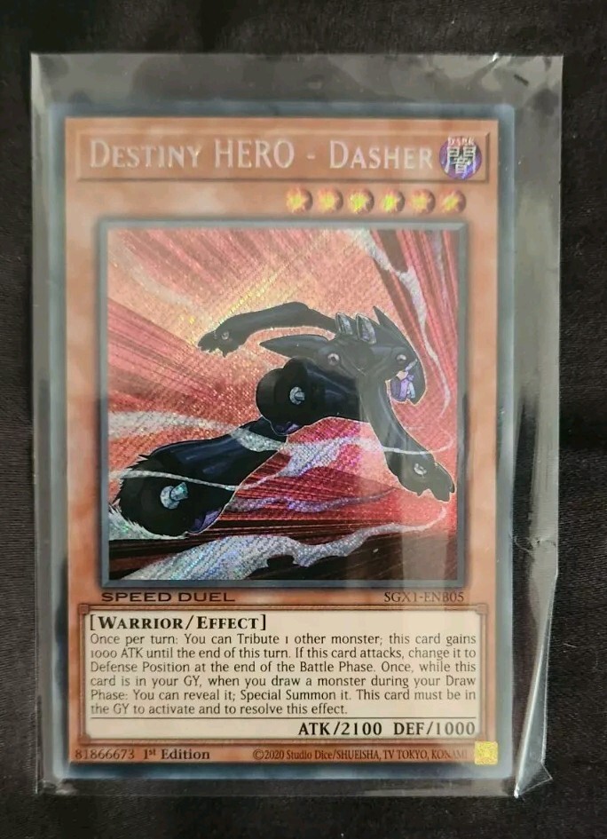 This is a rare and highly sought-after Yu-Gi-Oh! TCG card featuring Destiny Hero - Dasher. The card is a Secret Rare with a Misprint Holo Finish, making it an incredibly unique addition to any collection. The card is from the Yugi set and is an 1st Edition, further adding to its value and rarity. The card is manufactured by Konami and is perfect for collectors and players alike. Its rarity and unique features make it a must-have for anyone serious about completing their Yu-Gi-Oh! TCG collection. Don't miss out on the opportunity to add this incredible card to your collection today!