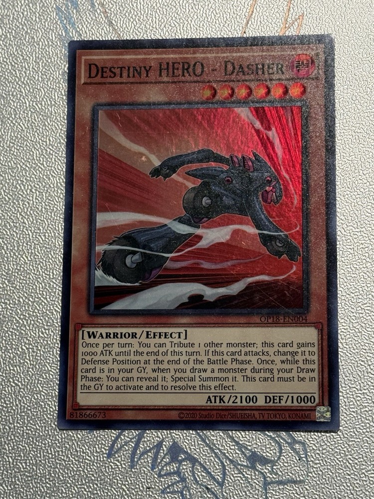 The "Destiny HERO - Dasher" card is a Super Rare card from the OTS Tournament Pack 18 in the Yu-Gi-Oh! TCG. It is an English language card manufactured by Konami, featuring a Warrior monster type with Dark attribute. The card has an Attack/Power of 2100 and a Defense/Toughness of 1000, making it a formidable addition to any deck. This Effect card, with card number OP18-EN004, is a sought-after collectible for players and collectors alike.