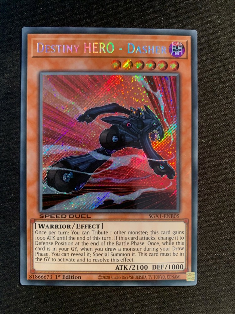 Destiny HERO - Dasher - SGX1-ENB05 - Secret Rare - 1st Edition - Speed Duel N/M Card is 1st Edition Cards are in Near Mint Condition Combined Shipping is offered on all of my TCG Listings. When Checking out with multiple cards in your cart, click ‘Request total from seller’. This will allow me to combine the shipping for multiple cards if purchased together. If this does not show up for you, then please message me and I’ll create a listing for your order. Any Further Questions Please Message Me Thanks