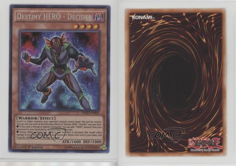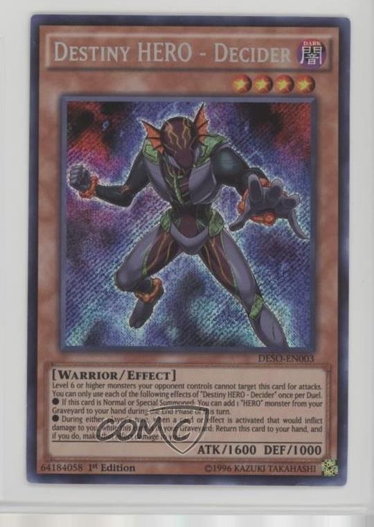 2016 Yu-Gi-Oh! - Destiny Soldiers - [Base] - 1st Edition #DESO-EN003 Secret Rare - Destiny HERO - Decider COMC Item: 185068600 - YuGiOh Card Search for more: 2016 Yu-Gi-Oh! - Destiny Soldiers Search for more: 2016 Yu-Gi-Oh! - Destiny Soldiers - [Base] - 1st Edition View all of our Listings Auctions Buy It Now About Us Located in the beautiful Pacific Northwest, COMC (Check Out My Cards) is the world's largest consignment service for trading card singles. More than 10,000 people have used our consignment service to list over 50 million trading cards. Find out how we can help you consign your items on eBay by contacting us through eBay messaging. COMC -- "The Safe & Easy Way to Buy & Sell" Raw Condition for Modern Cards Unless otherwise noted, raw modern cards are listed in Near Mint-Mint condition or better. A NM-MT card appears to be Mint at first glance, but upon closer inspection, may exhibit some of the following: minor print defects (e.g. roller marks, print line, dimple), minor scratches, slight edge wear, and slight corner wear. Centering is clearly visible in the images provided and does not factor into our condition assessment. Raw Condition for Vintage Cards Unless otherwise noted, raw vintage cards are listed in Excellent condition or better. An EX card may exhibit some of the following: minor rounding of corners, surface wear, print defects, light scratches, and slight edge wear/chipping. Centering is clearly visible in the images provided and does not factor into our condition assessment. Domestic Shipping Combined shipping for multiple items is available. To receive combined shipping, please ensure all desired items are in your eBay shopping cart before proceeding to checkout. eBay limits orders to 40 items per order. We automatically combine multiple orders placed on the same day. If you place multiple orders on the same day, please contact us to request a refund of applicable shipping costs. Signature confirmation may be required on invoices over $400. All cards are protected and shipped securely. International Shipping COMC offers eBay's International Shipping (EIS) for international orders under $2,500* (see country exceptions below). All duties and import fees are paid at checkout; in the rare event that there are additional import fees upon delivery, these are borne by the buyer. EIS packages route through a shipping hub in Erlanger, KY before shipping to their final destination. Please note that EIS does not allow for combined shipments. The shipping rates are determined by eBay and cannot be adjusted. *Maximum sale price exceptions: Colombia, Kuwait ($2,000); Taiwan ($1,539); Chile, Costa Rica, Guatemala, Honduras, Trinidad and Tobago ($1,000); Antigua and Barbuda, Aruba, Belize, Dominica, Grenada, Philippines, Saint Kitts and Nevis, Saint Lucia, Montserrat, Turks and Caicos Islands ($500); Dominican Republic, El Salvador ($200). Please request a shipping quote through eBay messaging for orders that exceed the maximum sale price supported by eBay's International Shipping. You will be responsible for all duties and import fees for international orders shipped outside the EIS. All cards are protected and shipped securely. Payment COMC does not accept offers on our cards through our eBay storefront. COMC utilizes eBay’s managed payments system. If you are experiencing difficulties making a payment, please contact eBay for assistance. Return Policy Returns are only accepted on the rare occasion the item is not as described. If you are making a return, please initiate the return process through eBay so a mailing label can be provided for you. Prior to listing, our expert team carefully assessed this item to represent it accurately. Please review the description and high-definition images prior to purchasing to ensure this item meets your satisfaction. We welcome you to contact us if you have further questions about this item. Trust and Integrity COMC carefully assesses each item consigned to us to prevent fraudulent items from entering the marketplace. If you believe an item offered on COMC may be fraudulent, please contact us with details so we can investigate the issue. Items we determine are outside our supported items policy may be removed. Last Modified: 5/30/2025 1:33:12 AM PDT