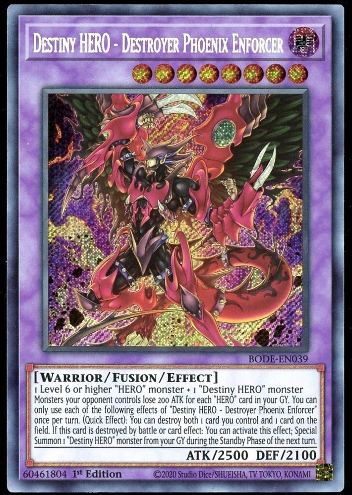 Card: Destiny HERO - Destroyer Phoenix Enforcer Rarity: Secret Rare Condition: NM Please view photos for scans of the card! Shipping in an eBay trading card envelope. I ship international through eBay International Shipping. Interested in more than one card? Check out in the same order to save on shipping! Please contact me if you have any questions.