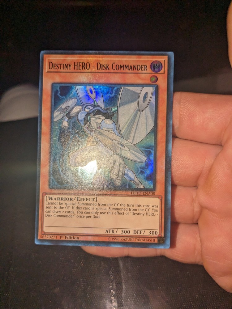 This listing is for a 1st edition ultra rare card of Destiny HERO - Disk Commander from the Yu-Gi-Oh! TCG. The card is in near mint condition and comes with a bonus. It is manufactured by Konami and is in English language. It is a highly sought after card and is classified as ultra rare. It falls under the category of collectible card games and is a part of CCG individual cards. The card is non-domestic and is not modified in any way. It is a great addition to any collection.