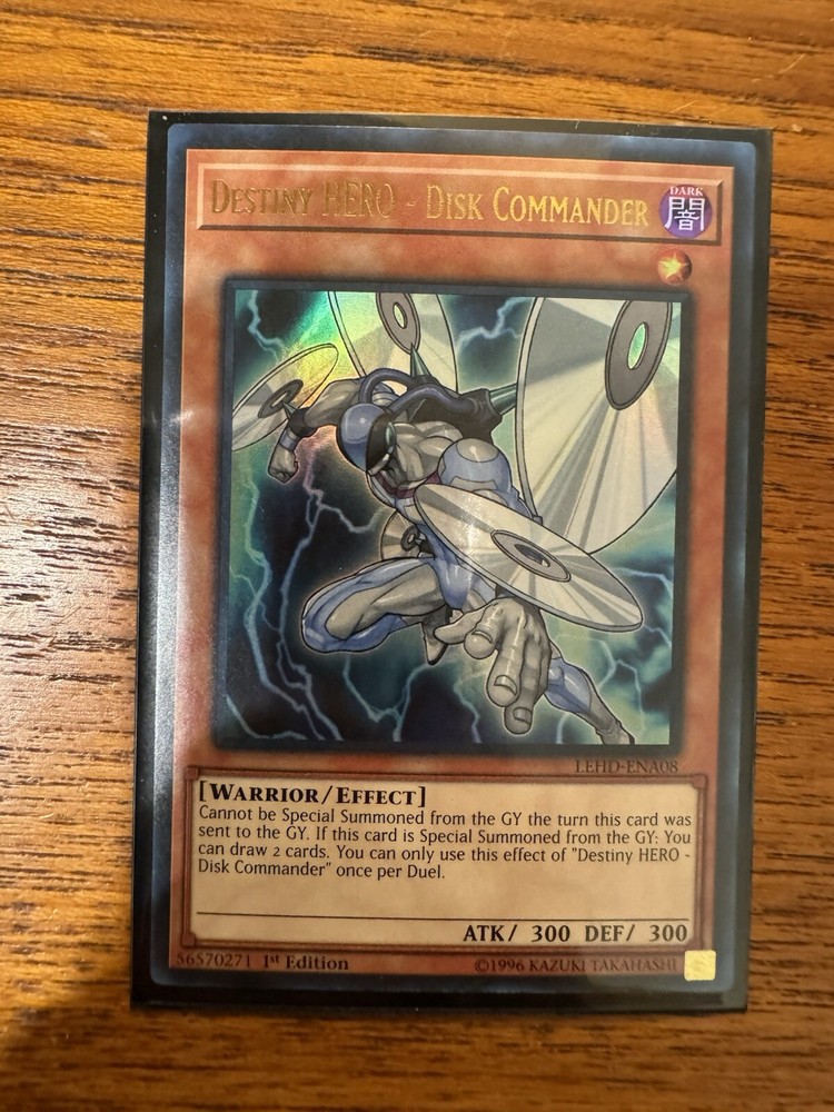 Elevate your Yu-Gi-Oh! TCG strategy with the Destiny Hero - Disk Commander (LEHD-ENA08), a formidable warrior from the Legendary Hero Decks collection. As a 1st Edition Ultra Rare card, it stands out with its Dark attribute and 300 DEF/ATK combo, ready to make a significant impact in your battles. Crafted by Konami and presented in English, this card is a must-have for collectors and players alike. The card's effect type enhances its tactical value, while its Level 1 classification indicates its potential for early game advantage. Add Disk Commander to your arsenal and assert dominance in the dueling arena.