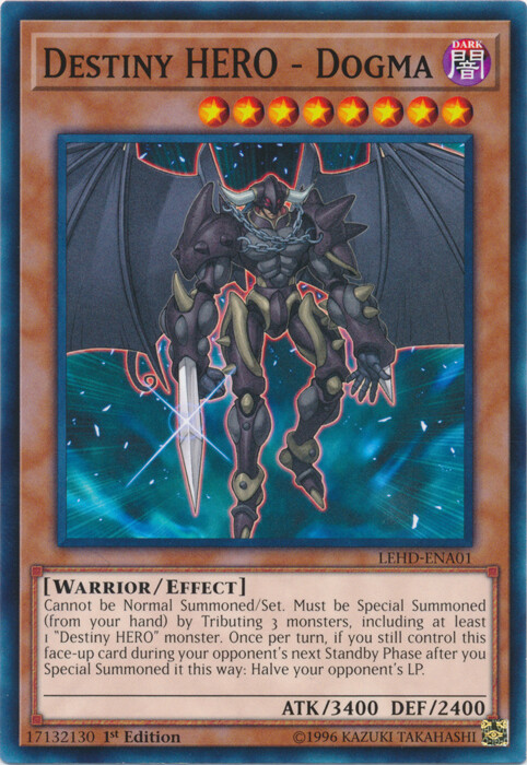 Please, carefully read the following: Image shown is a stock photo and does not reflect the actual card you will be receiving. Please refer to the condition guide below, the title and item description for what you will be receiving. Please also be aware that due to plastic shortages, orders may not always come in a plastic toploader but will always be protected as much as possible to prevent damage. You will receive 1x Destiny HERO - Dogma - LEHD-ENA01 - Common - 1st Edition - Condition: Near Mint Please refer to the Title and Item Description above for the item being purchased. Delivery delays: Deliveries may not always fall within the estimated delivery dates when shipping outside of Canada and USA. Many factors may contribute to delays in delivering the package such as weather and customs. Please note that delivery to international locations may take up to 8 weeks to arrive . We always ship out orders within 1 business day and after dropping off with the post office, delivery times are out of our control. Feedback: We will always leave positive feedback for you and we ask if you can do the same for us. If there is any reason why the transaction was not up to your expectations, please message us before leaving feedback so we can address the issue. Combined shipping: To receive a combined shipping quote, please make sure that you commit to purchasing on ebay.ca . This allows us to send you a combined shipping invoice before payment. Shipping within the USA (6-10 Business days): FREE! Shipping within Canada (3-8 Business days): FREE! Shipping and handling delay: We aim to ship all orders within 1 business day. We do not ship on weekends and holidays. Condition Guide: We do not sell any cards that are in MINT condition, the best condition that we offer is near mint. Near Mint (NM) - Cards in Near Mint condition show minimal to no wear from shuffling, play or handling and can have a nearly unmarked surface, crisp corners and unblemished edges outside of a few minimal flaws. A Near Mint card may have a tiny edge nick or a tiny scratch or two, but overall look nearly unplayed with no major defects or flaws. Lightly Played (LP) - Cards in Lightly Played condition may have minor border or corner wear or even just slight scuffs or scratches. There are no major defects such as water damage, bends or issues with the structural integrity of the card. Noticeable imperfections are okay, but none should be too severe or at too high a volume. Moderately Played (MP) - Cards in Moderately Played condition exhibit condition issues visible at a casual glance. Cards in Moderately Played condition can have border wear, corner wear, scratching or scuffing, creases or whitening, minor dirt buildup or any combination of mild examples of these marks. A Moderately Played card may have some form of a more major marking, such as spot water damage or creasing that doesnʼt affect card integrity, but not in combination with other issues such as scratches, scuffs or border/edge wear and not impacting a large area of the card. Heavily Played (HP) - Cards in Heavily Played condition show a severe amount of wear. Heavily Played condition can include cards that have major creasing, major whitening, major border wear or any combination of those flaws. (These flaws cannot prevent the card from being tournament playable when sleeved.) Damaged - Cards in Damaged condition can exhibit a tear, bend or crease that may make the card illegal for tournament play, even in a sleeve. Cards in Damaged condition may have extreme border wear, extreme corner wear, heavy scratching or scuffing, folds, creases or tears or other damages that impacts the structural integrity of the card.