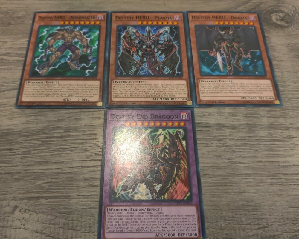 This set is a must-have for Destiny HERO fans! Dogma and End Dragoon arrived in perfect condition, while Plasma and Dreadmaster have barely noticeable wear. Super fast shipping and great packaging—highly recommend this seller for Yu-Gi-Oh! collectors!