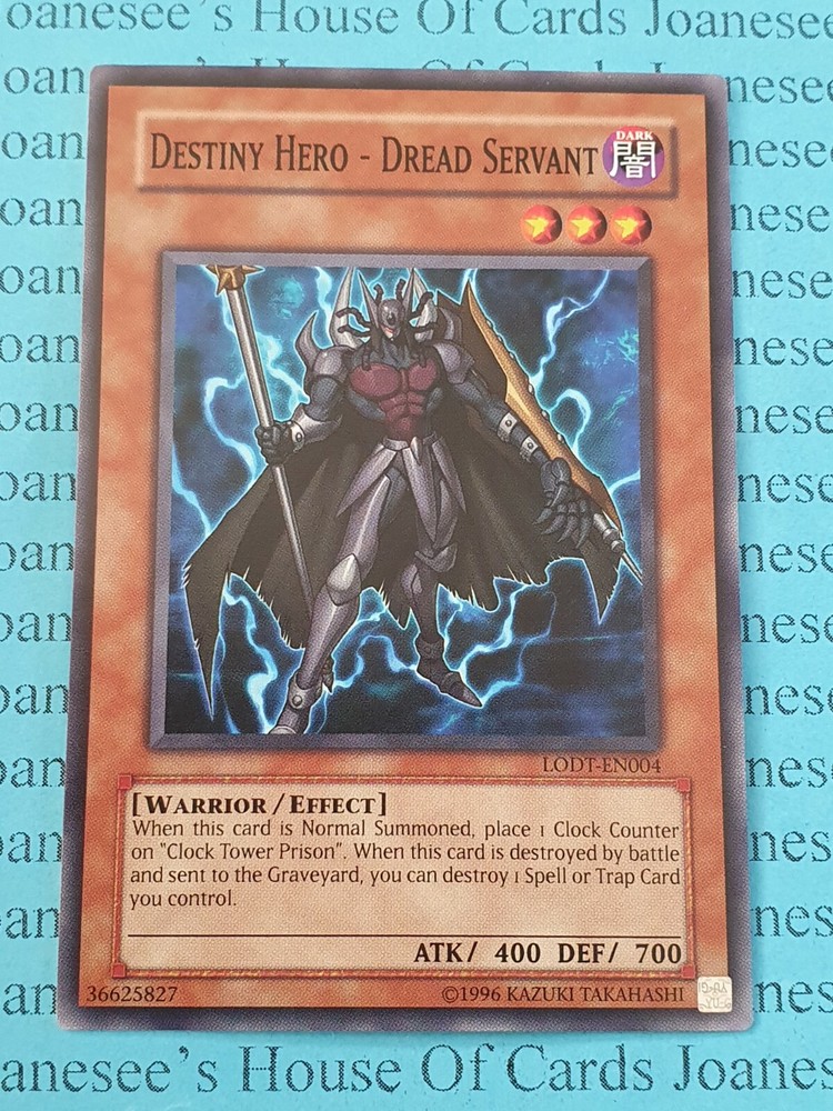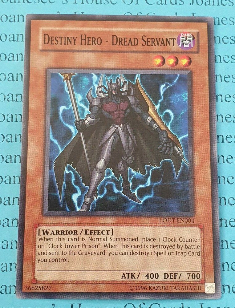 This is a Common Dark Warrior Destiny HERO - Dread Servant 3 Stars ATK/400 DEF/700 Card text: If this card is Normal Summoned: Place 1 Clock Counter on each "Clock Tower Prison". When this card is destroyed by battle and sent to the GY: You can target 1 Spell/Trap you control; destroy that target. LODT-EN004 Unlimited Edition English Near Mint Condition Totally Original Konami (or your money back!) I will deliver in safe packaging to keep it in perfect condition. Ideal for players and collectors alike. Check out my other items! I will combine postage costs for multiple purchases. Sign up for my email newsletters by adding my eBay Shop to your favourites