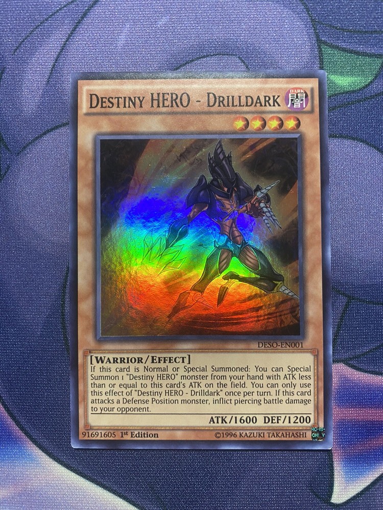 Near Mint. Will ship ASAP This Yu-Gi-Oh! TCG card from the Destiny Soldiers set features the Super Rare Destiny HERO - Drilldark. Known for its powerful Monster Card Type, this card is a must-have for any serious collector. This particular card is a 1st Edition and highly sought after by enthusiasts.
