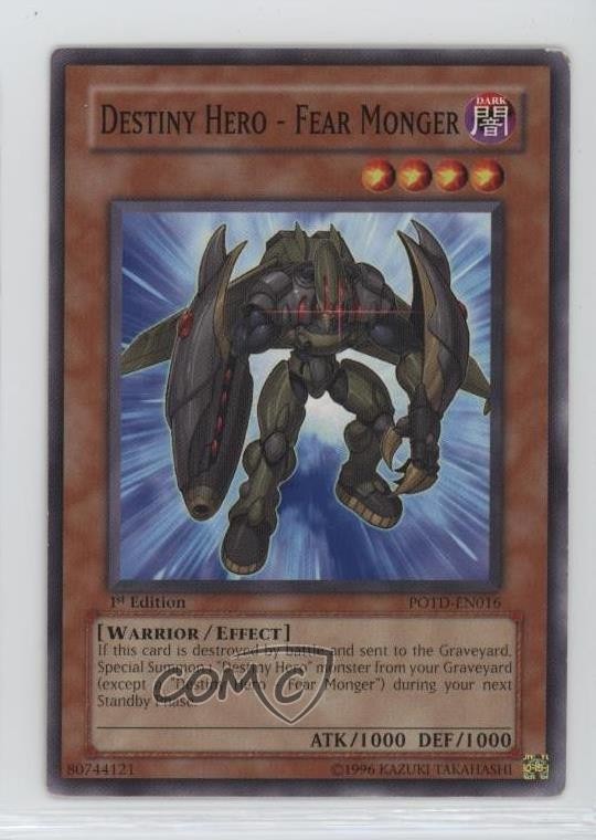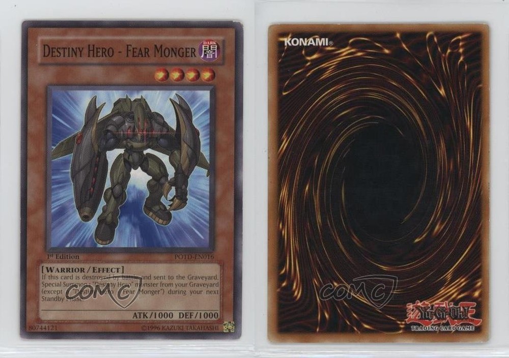 2006 Yu-Gi-Oh! Power of the Duelist - Booster Pack [Base] - 1st Edition #POTD-EN016.1 Destiny HERO - Fear Monger COMC Item: 172152527 - YuGiOh Card - Featuring Destiny HERO - Fear Monger Search for more: 2006 Yu-Gi-Oh! Power of the Duelist Search for more: 2006 Yu-Gi-Oh! Power of the Duelist - Booster Pack [Base] - 1st Edition View all of our Listings Auctions Buy It Now About Us Located in the beautiful Pacific Northwest, COMC (Check Out My Cards) is the world's largest consignment service for trading card singles. More than 10,000 people have used our consignment service to list over 50 million trading cards. Find out how we can help you consign your items on eBay by contacting us through eBay messaging. COMC -- "The Safe & Easy Way to Buy & Sell" Raw Condition for Modern Cards Unless otherwise noted, raw modern cards are listed in Near Mint-Mint condition or better. A NM-MT card appears to be Mint at first glance, but upon closer inspection, may exhibit some of the following: minor print defects (e.g. roller marks, print line, dimple), minor scratches, slight edge wear, and slight corner wear. Centering is clearly visible in the images provided and does not factor into our condition assessment. Raw Condition for Vintage Cards Unless otherwise noted, raw vintage cards are listed in Excellent condition or better. An EX card may exhibit some of the following: minor rounding of corners, surface wear, print defects, light scratches, and slight edge wear/chipping. Centering is clearly visible in the images provided and does not factor into our condition assessment. Domestic Shipping Combined shipping for multiple items is available. To receive combined shipping, please ensure all desired items are in your eBay shopping cart before proceeding to checkout. eBay limits orders to 40 items per order. We automatically combine multiple orders placed on the same day. If you place multiple orders on the same day, please contact us to request a refund of applicable shipping costs. Signature confirmation may be required on invoices over $400. All cards are protected and shipped securely. International Shipping COMC offers eBay's International Shipping (EIS) for international orders under $2,500* (see country exceptions below). All duties and import fees are paid at checkout; in the rare event that there are additional import fees upon delivery, these are borne by the buyer. EIS packages route through a shipping hub in Erlanger, KY before shipping to their final destination. Please note that EIS does not allow for combined shipments. The shipping rates are determined by eBay and cannot be adjusted. *Maximum sale price exceptions: Colombia, Kuwait ($2,000); Taiwan ($1,539); Chile, Costa Rica, Guatemala, Honduras, Trinidad and Tobago ($1,000); Antigua and Barbuda, Aruba, Belize, Dominica, Grenada, Philippines, Saint Kitts and Nevis, Saint Lucia, Montserrat, Turks and Caicos Islands ($500); Dominican Republic, El Salvador ($200). Please request a shipping quote through eBay messaging for orders that exceed the maximum sale price supported by eBay's International Shipping. You will be responsible for all duties and import fees for international orders shipped outside the EIS. All cards are protected and shipped securely. Payment COMC does not accept offers on our cards through our eBay storefront. COMC utilizes eBay’s managed payments system. If you are experiencing difficulties making a payment, please contact eBay for assistance. Return Policy Returns are only accepted on the rare occasion the item is not as described. If you are making a return, please initiate the return process through eBay so a mailing label can be provided for you. Prior to listing, our expert team carefully assessed this item to represent it accurately. Please review the description and high-definition images prior to purchasing to ensure this item meets your satisfaction. We welcome you to contact us if you have further questions about this item. Trust and Integrity COMC carefully assesses each item consigned to us to prevent fraudulent items from entering the marketplace. If you believe an item offered on COMC may be fraudulent, please contact us with details so we can investigate the issue. Items we determine are outside our supported items policy may be removed. Last Modified: 6/3/2025 3:56:50 AM PDT
