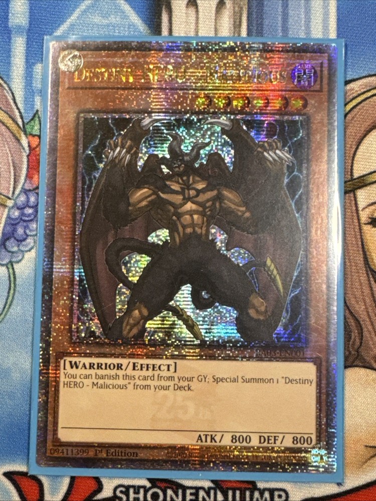 Destiny HERO - Malicious 1st Edition Quarter Century Secret Rare RA03-EN001. Condition is Ungraded. Shipped with Canada Post Regular Parcel.