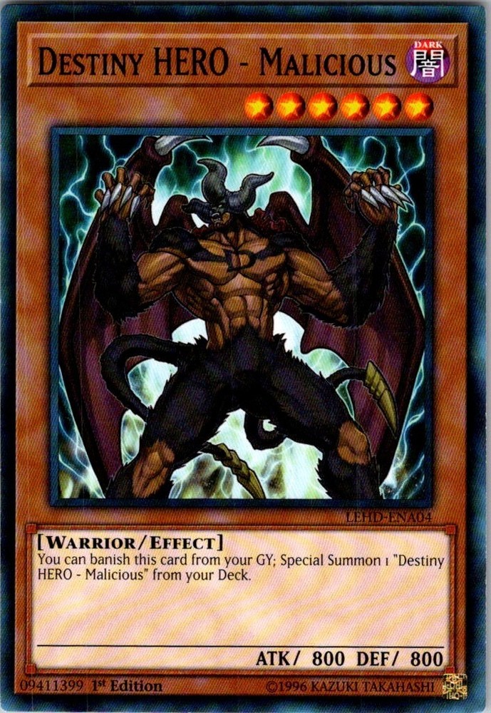 3Unleash the power of Destiny HERO - Malicious LEHD-ENA04, a Common card that adds a strategic edge to your Yu-Gi-Oh! TCG arsenal. As a 1st Edition piece, it's a must-have for collectors and competitive players alike. Manufactured by Konami, this card features the Regular finish that players have come to expect from their monster cards. This card is perfect for anyone over the age of 6, ensuring that it's accessible and enjoyable for a wide audience of Yu-Gi-Oh! enthusiasts. With its English language print, it's easily understandable and ready to be integrated into your deck. Whether you're looking to strengthen your gameplay or round out your collection, Destiny HERO - Malicious is an excellent choice.