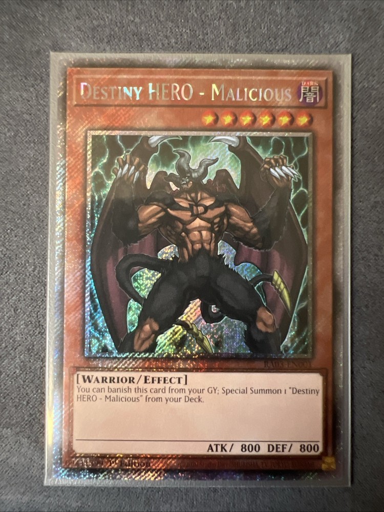 The "Destiny HERO - Malicious" card is a Platinum Secret Rare 1st Edition collectible card from the Quarter Century Bonanza set in the Yu-Gi-Oh! TCG. This Dark type Warrior creature has a high Defense/Toughness and Attack/Power of 800, making it a formidable addition to any card game collection. Manufactured by Konami, this English-language card features unique abilities and is a sought-after item for collectors and players alike.