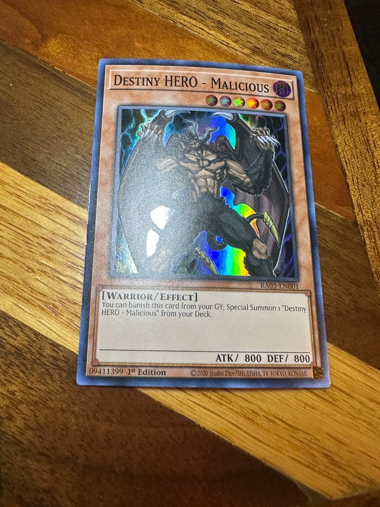 Hello! You are buying one Destiny HERO - Malicious RA03-EN001 1st Edition Super Rare in near-mint condition! As a thank you for buying from me, I will throw in two free Yugioh commons! Thank you so much for looking, have a great day! If there is ever an issue, please let me know so I can do whatever I can to resolve it! Please check out my other items! I have many more single cards!