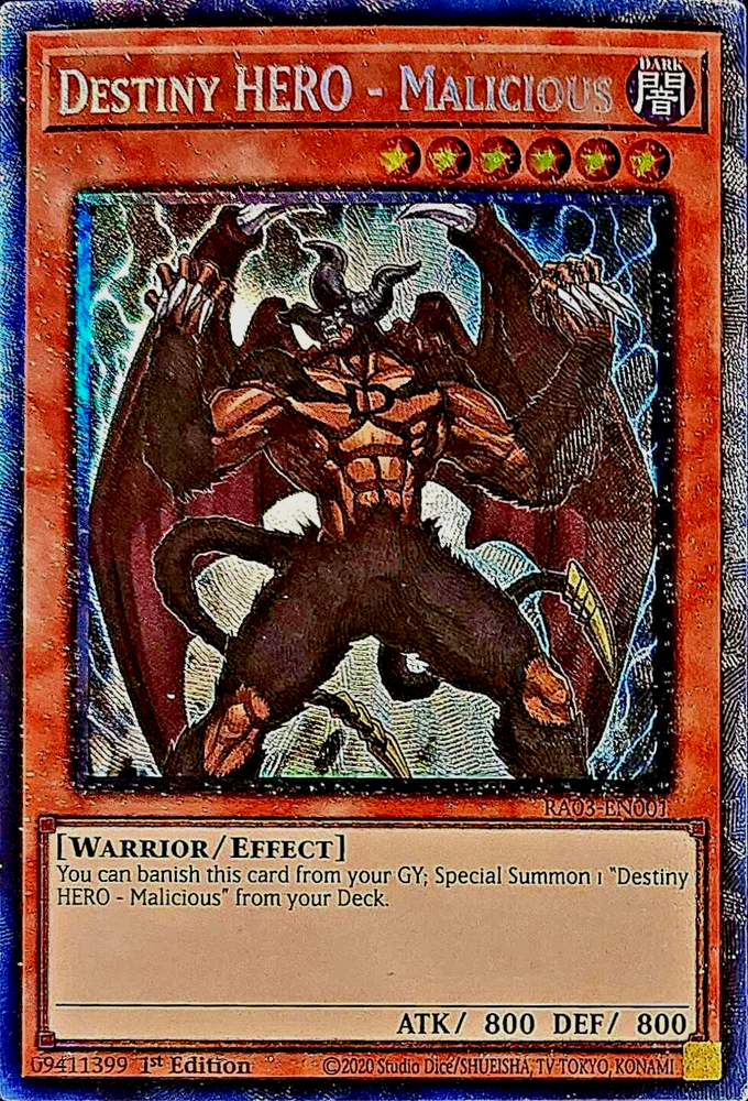 Bluefires Stuff daniel8769-2008 has 99.1% Positive Feedback Welcome! At my store, you will find collectibles and refurbished tech. From recycled memory chips and processors to a variety of storage drives and rebuilt desktops and laptops. I try to keep a variety of products available for everyone. From a single Yu-Gi-Oh! card to a full themed structure Destiny HERO - Malicious RA03-EN001. C ondition is "New". Shipped with USPS. Item Description Buyers Note: Near Mint for any collector or player. This card is in Near Mint or better. Card Name: Destiny HERO - Malicious RA03-EN001 - 1st Edition Set: RA03 - Quarter Century Bonanza Quantity: 1 Edition: 1st Rarity: Prismatic Collector's Rare Condition: NM Payment Information & Terms of Sale Credit Cards: We accept Visa, MasterCard, American Express, and Discover Card through PayPal. Payments are due within 3 days of purchase date! Sorry, no exceptions! Orders are shipped within 24 hours of payment. Orders placed & paid after 12noon PST on Fridays, weekends (Saturdays & Sundays), and Holidays are shipped the following business day. Cards shipped First Class Mail are in a hard plastic top loader with a Waterproof/Tear resistant Bubble Envelope w/Delivery Confirmation, NO INSURANCE! I RECOMEND THIS FOR DELIVERIES OUTSIDE THE CONTENINTAL USA. Continental USA & select countries (Canada, Europe, Australia) Residents of Puerto Rico can only use this service. Cards shipped eBay Standard Envelope for Trading Cards up to $20 are mailed in a standard letter envelope with a hard plastic top loader w/Delivery Confirmation. Delivery can take up to 3 to 5 business days . Continental USA & select countries (Canada, Europe, Australia) THIS SERVICE IS NOT AVAILABLE TO ADDRESSES TO PUERTO RICO. Cards shipped with free shipping are mailed in a standard letter envelope with a hard plastic top loader w/Delivery Confirmation. Delivery can take up to 3 to 5 business days . Continental USA & select countries (Canada, Europe, Australia) This service is excluded for Puerto Rico . I ship Worldwide! I am not responsible for any International customs, taxes, fees, etc. It’s the buyer’s full responsibility. Give up to 30 days time for deliveries outside the Continental U.S. I have no control over administration issues of services provided by other countries and their governments. Once product leaves the U.S please be patient if delivery is delayed. Condition Guide: I do not sell any cards that are in MINT condition, the best condition that we offer is near mint. Near Mint (NM) - Cards in Near Mint condition show minimal to no wear from shuffling, play or handling and can have a nearly unmarked surface, crisp corners and unblemished edges outside of a few minimal flaws. A Near Mint card may have a tiny edge nick or a tiny scratch or two, but overall look nearly un-played with no major defects or flaws. Lightly Played (LP) - Cards in Lightly Played condition may have minor border or corner wear or even just slight scuffs or scratches. There are no major defects such as water damage, bends or issues with the structural integrity of the card. Noticeable imperfections are okay, but none should be too severe or at too high a volume. Moderately Played (MP) - Cards in Moderately Played condition exhibit condition issues visible at a casual glance. Cards in Moderately Played condition can have border wear, corner wear, scratching or scuffing, creases or whitening, minor dirt buildup or any combination of mild examples of these marks. A Moderately Played card may have some form of a more major marking, such as spot water damage or creasing that doesnʼt affect card integrity, but not in combination with other issues such as scratches, scuffs or border/edge wear and not impacting a large area of the card. Heavily Played (HP) - Cards in Heavily Played condition show a severe amount of wear. Heavily Played condition can include cards that have major creasing, major whitening, major border wear or any combination of those flaws. (These flaws cannot prevent the card from being tournament playable when sleeved.) Damaged - Cards in Damaged condition can exhibit a tear, bend or crease that may make the card illegal for tournament play, even in a sleeve. Cards in Damaged condition may have extreme border wear, extreme corner wear, heavy scratching or scuffing, folds, creases or tears or other damages that impacts the structural integrity of the card