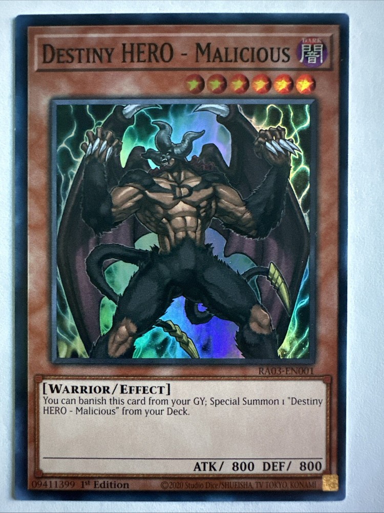 Elevate your Yu-Gi-Oh! TCG collection with the formidable Destiny HERO - Malicious card from the Quarter Century Bonanza set. This Prismatic Ultimate Rare card, with its dark attribute, is a warrior in both spirit and might, boasting an attack and defense power of 800. The card number RA03-EN001 signifies its unique identity in the series. Destiny HERO - Malicious is not just a powerful effect card, but it's also a collectible piece for enthusiasts. Released by Konami and presented in English, this 1st Edition card is a testament to the game's rich history and the player's dedication to the craft. No autograph enhances the card's pristine quality, ensuring it stands out in any collection.