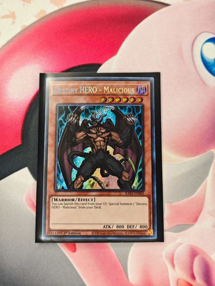 This is a rare and highly sought-after Destiny HERO card from the Yu-Gi-Oh! TCG. With a dark color and warrior creature type, this card features 800 defense/toughness and 800 attack/power. It is a secret rare card from the Quarter Century Bonanza set, with a 1st edition and English language. The card number is RA03-EN001 and it is an effect type card manufactured by Konami. Perfect for collectors and players alike, this card is sure to be a valuable addition to any collection.