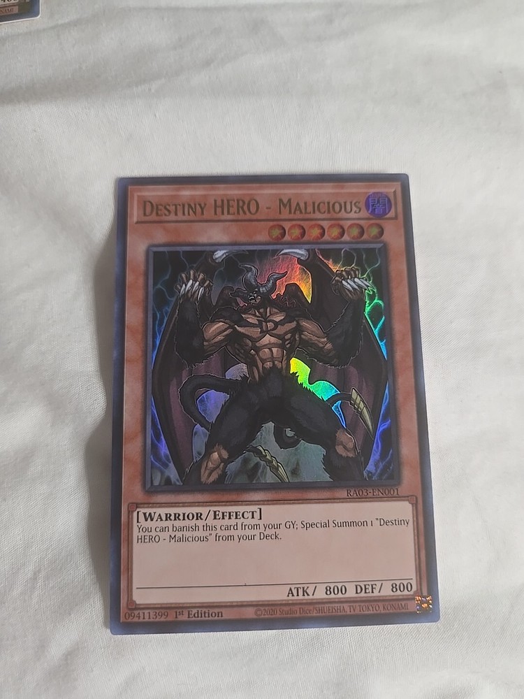 Elevate your Yu-Gi-Oh! TCG collection with the formidable Destiny HERO - Malicious card from the Quarter Century Bonanza set. As an Ultra Rare card with an attack and defense power of 800, it's a substantial addition to any deck or display. The card number RA03-EN001 denotes its unique identity within the series, and being a 1st Edition makes it a sought-after piece for collectors. Destiny HERO - Malicious is an Effect-type Warrior card that exudes power and strategy potential. Crafted by Konami and featured in English, it caters to both gamers and collectors. Its dark attribute brings a touch of adversity to the game, making it an intriguing card to incorporate into your tactical arsenal or to showcase as a standout piece in your collection.