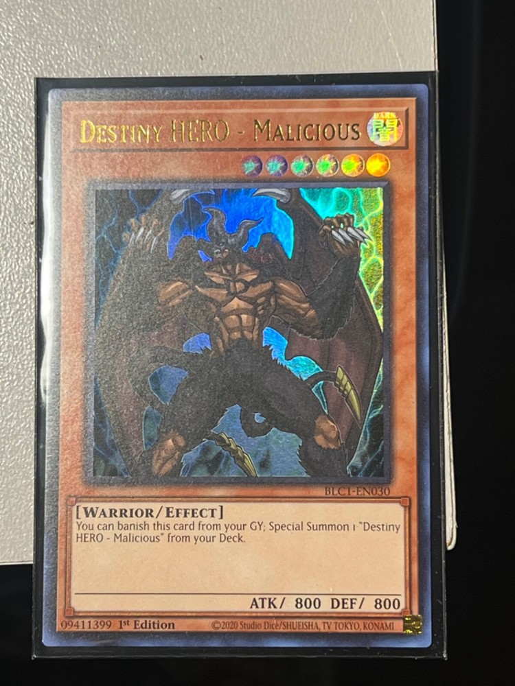 This Japanese-sized card from the Battles of Legend: Chapter 1 set features the effect type Destiny HERO - Malicious in ultra-rare gold 1st edition. The card is made of card stock with a holographic finish and is in English language. It belongs to the Yu-Gi-Oh! TCG game and the Card attribute/MTG:Color: Dark, Creature/Monster Type: Warrior, and Card Type: Effect categories. The card name is Destiny HERO - Malicious, and it is manufactured by Konami in the United States. The card number is BLC1-EN030, and it is a must-have for collectors and fans of the Yu-Gi-Oh! franchise.