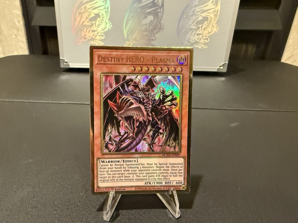 The Destiny HERO - Plasma card is a Dark Warrior monster with 1900 ATK and 600 DEF, belonging to the Maximum Gold: El Dorado set of the Yu-Gi-Oh! TCG. It is a Premium Gold Rare card with an Effect type, bearing the 1st Edition feature. Manufactured by Konami, this English language card is numbered MGED-EN007, making it a highly sought-after collectible for fans of the game.