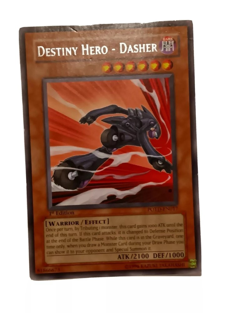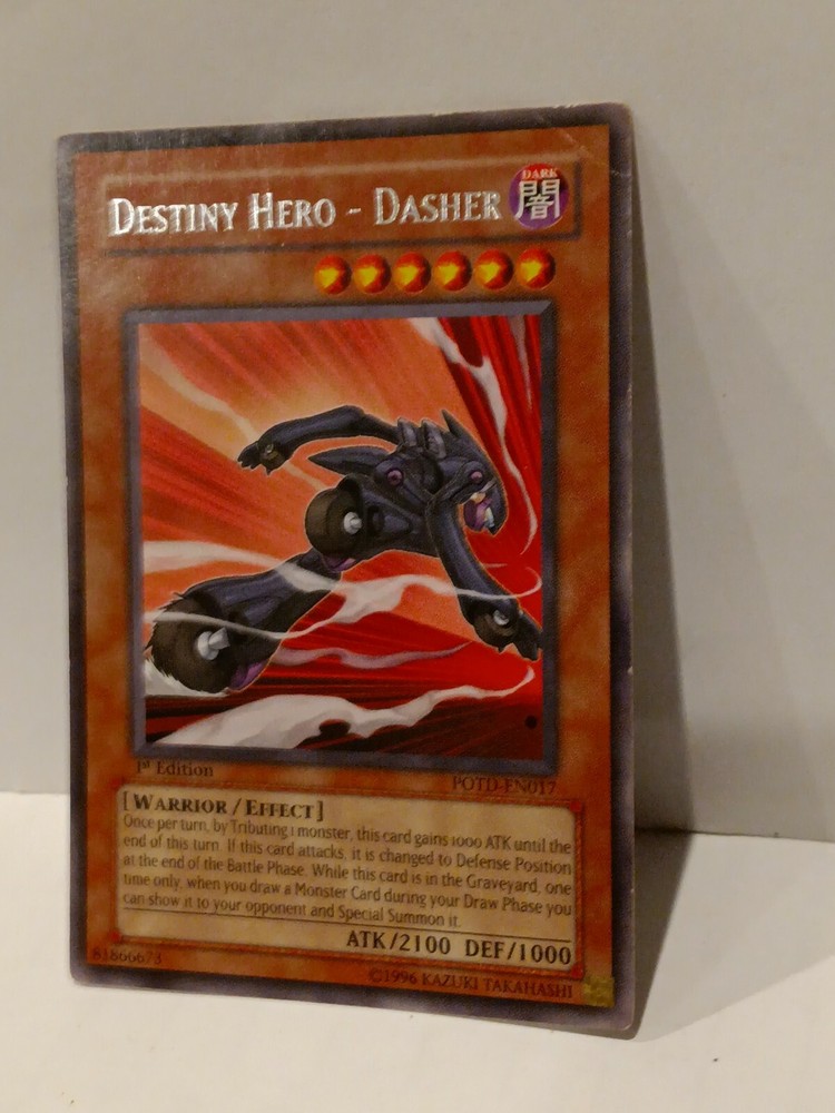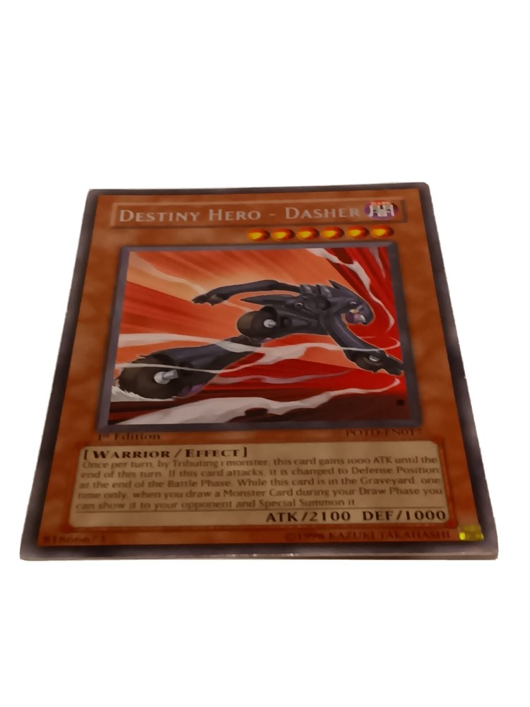 Destiny Hero - Dasher - POTD-EN017 - Rare 1st Edition Power of the Duelist. Few small creases at top of card from being stored away. Power of the Duelist was the 20th expansion of the Yugioh TCG. It was released in August of 2006 and consisted of 85 cards total. Noteworthy cards from Power of the Duelist include Chimeratech Overdragon , Elemental Hero Dark Neos , Future Fusion & Neo-Spacian Dark Panther . This set is the first that uses a 4 character naming system instead of the previous 3 character version. This set also introduces “Alien” monsters. Power of the Duelist consists of the following rarity breakdown: 35 Commons 14 Rares 7 Super Rares 4 Ultra Rares 25 Ultimate Rares