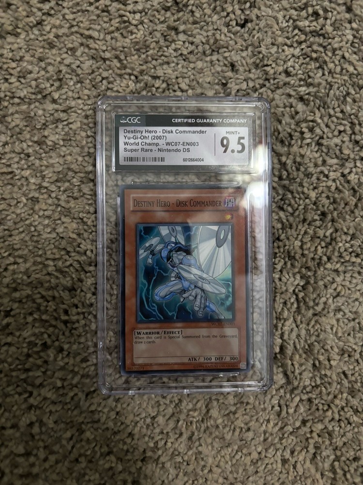 Incredible find! This Destiny Hero - Disk Commander is in flawless CGC 9.5 condition, making it a true collector's gem. With only one graded at this level, it’s an ultra-rare piece that any Yu-Gi-Oh! enthusiast would be thrilled to own. The card looks pristine, and the WC07-EN003 rarity adds even more value. A must-have for serious collectors!