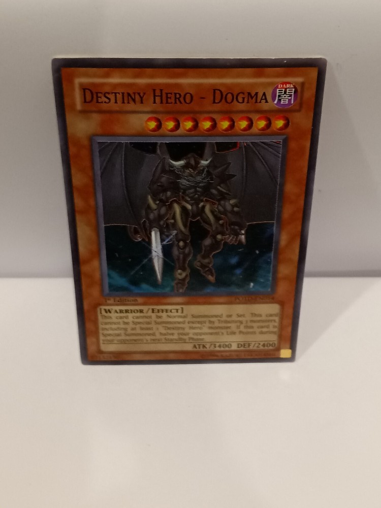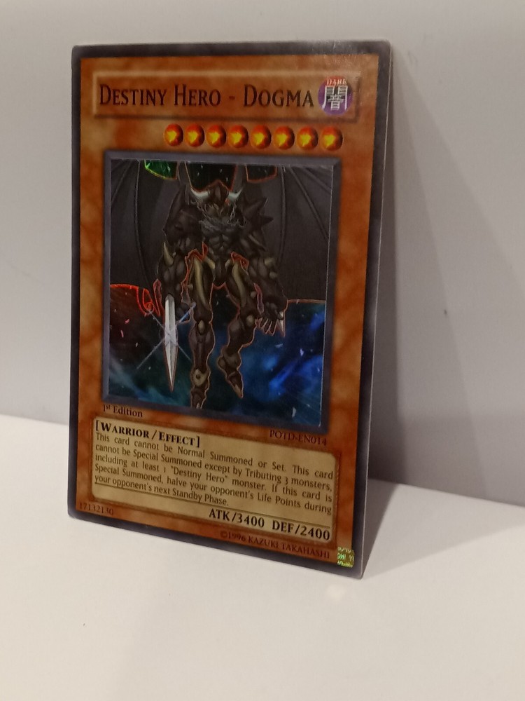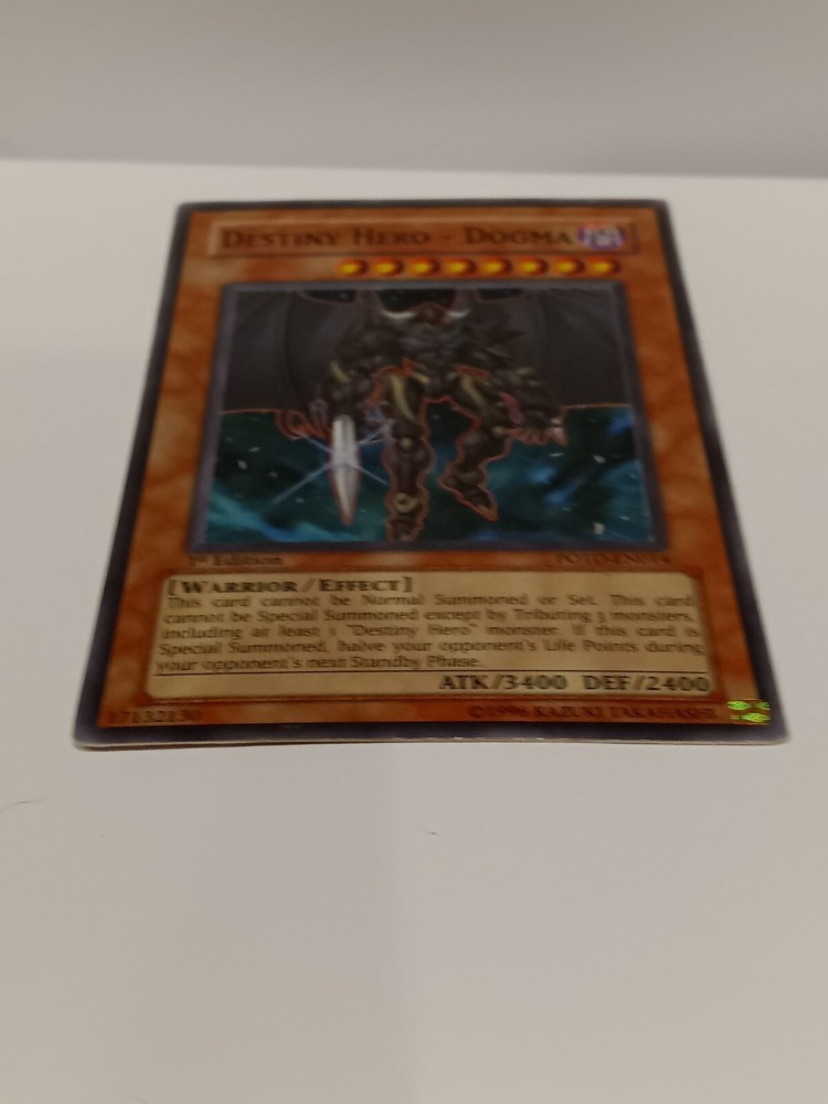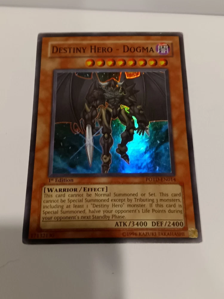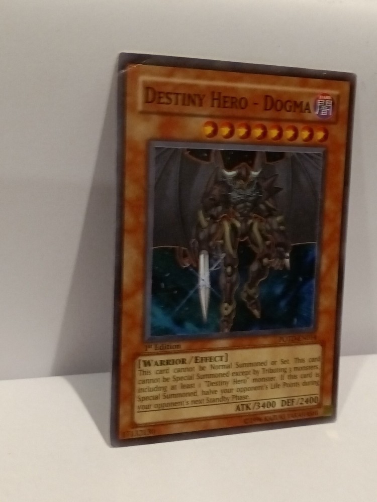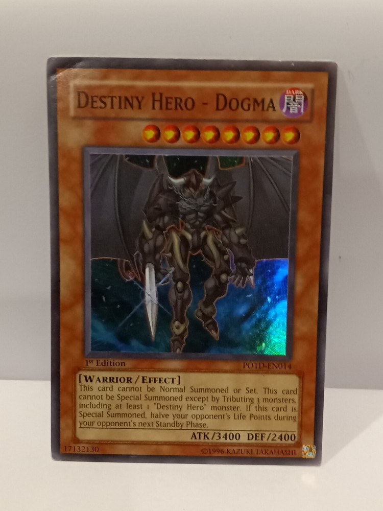 Destiny Hero - Dogma - POTD-EN014 - Super Rare 1st Edition Power of the Duelis. Rarity Super Rare Description Power of the Duelist was the 20th expansion of the Yugioh TCG. It was released in August of 2006 and consisted of 85 cards total. Noteworthy cards from Power of the Duelist include Chimeratech Overdragon , Elemental Hero Dark Neos , Future Fusion & Neo-Spacian Dark Panther . This set is the first that uses a 4 character naming system instead of the previous 3 character version. This set also introduces “Alien” monsters. Power of the Duelist consists of the following rarity breakdown: 35 Commons 14 Rares 7 Super Rares 4 Ultra Rares 25 Ultimate Rares Small crease in left hand top corner of card