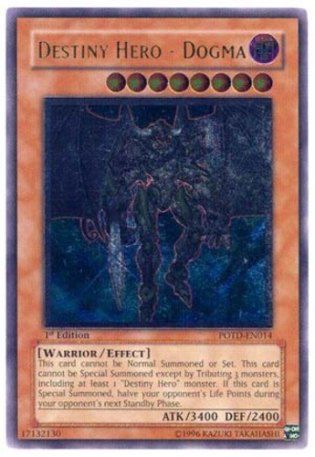 Please, carefully read the following: Image shown is a stock photo and does not reflect the actual card you will be receiving. Please refer to the condition guide below, the title and item description for what you will be receiving. Please also be aware that due to plastic shortages, orders may not always come in a plastic toploader but will always be protected as much as possible to prevent damage. You will receive 1x Destiny Hero - Dogma - POTD-EN014 - Ultimate Rare - 1st Edition - Condition: Lightly Played Please refer to the Title and Item Description above for the item being purchased. Delivery delays: Deliveries may not always fall within the estimated delivery dates when shipping outside of Canada and USA. Many factors may contribute to delays in delivering the package such as weather and customs. Please note that delivery to international locations may take up to 8 weeks to arrive . We always ship out orders within 1 business day and after dropping off with the post office, delivery times are out of our control. Feedback: We will always leave positive feedback for you and we ask if you can do the same for us. If there is any reason why the transaction was not up to your expectations, please message us before leaving feedback so we can address the issue. Combined shipping: To receive a combined shipping quote, please make sure that you commit to purchasing on ebay.ca . This allows us to send you a combined shipping invoice before payment. Shipping within the USA (6-10 Business days): FREE! Shipping within Canada (3-8 Business days): FREE! Shipping and handling delay: We aim to ship all orders within 1 business day. We do not ship on weekends and holidays. Condition Guide: We do not sell any cards that are in MINT condition, the best condition that we offer is near mint. Near Mint (NM) - Cards in Near Mint condition show minimal to no wear from shuffling, play or handling and can have a nearly unmarked surface, crisp corners and unblemished edges outside of a few minimal flaws. A Near Mint card may have a tiny edge nick or a tiny scratch or two, but overall look nearly unplayed with no major defects or flaws. Lightly Played (LP) - Cards in Lightly Played condition may have minor border or corner wear or even just slight scuffs or scratches. There are no major defects such as water damage, bends or issues with the structural integrity of the card. Noticeable imperfections are okay, but none should be too severe or at too high a volume. Moderately Played (MP) - Cards in Moderately Played condition exhibit condition issues visible at a casual glance. Cards in Moderately Played condition can have border wear, corner wear, scratching or scuffing, creases or whitening, minor dirt buildup or any combination of mild examples of these marks. A Moderately Played card may have some form of a more major marking, such as spot water damage or creasing that doesnʼt affect card integrity, but not in combination with other issues such as scratches, scuffs or border/edge wear and not impacting a large area of the card. Heavily Played (HP) - Cards in Heavily Played condition show a severe amount of wear. Heavily Played condition can include cards that have major creasing, major whitening, major border wear or any combination of those flaws. (These flaws cannot prevent the card from being tournament playable when sleeved.) Damaged - Cards in Damaged condition can exhibit a tear, bend or crease that may make the card illegal for tournament play, even in a sleeve. Cards in Damaged condition may have extreme border wear, extreme corner wear, heavy scratching or scuffing, folds, creases or tears or other damages that impacts the structural integrity of the card.