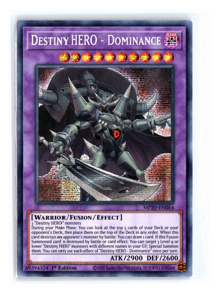 Destiny Hero - Dominance Prismatic MP20-EN064 Secret Rare - 1st Edition Yugioh Mint Condition Terms and Conditions • Sorry no international buyers • PAYPAL ONLY. Paypal Accepts credit card. • If you have any questions or quieries, just shoot me a message We are not responsible for any lost items during transit. Buyers automatically quality for free tracking when order is over $40. For combined shipping to save on shipping cost, PLEASE commit to the purchase of those items via then select the promotion postage option. AMAZING VALUE ! ROCK BOTTOM PRICE ! 100% AUTHENTIC Buyers automatically quality for free tracking when order is over $40 Items are usually sent securely double sleeved and with thin cardboard paddings if required. Otherwise , You may also add a top loader to your purchase ! Toploader: https://www.ebay.com.au/itm/352812399479 Shipping fee is $1 for the item but it will be deducted when you check out using combined shipping !