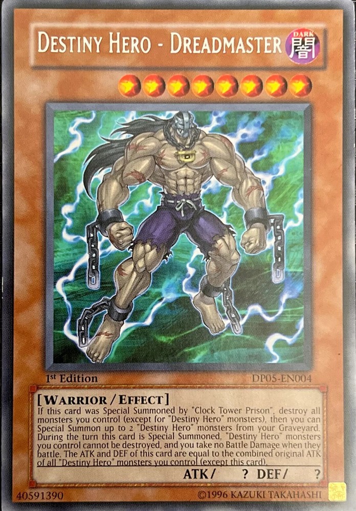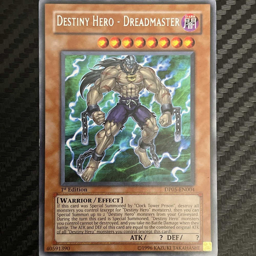 The product is a rare 1st Edition English card named "Destiny Hero - Dreadmaster" from the Yu-Gi-Oh! TCG Duelist Pack Special Edition set. Manufactured by Konami, it is an Effect card with a Regular finish. As a sought-after collectible in the CCG Individual Cards category, this card holds value for fans and collectors of the game.