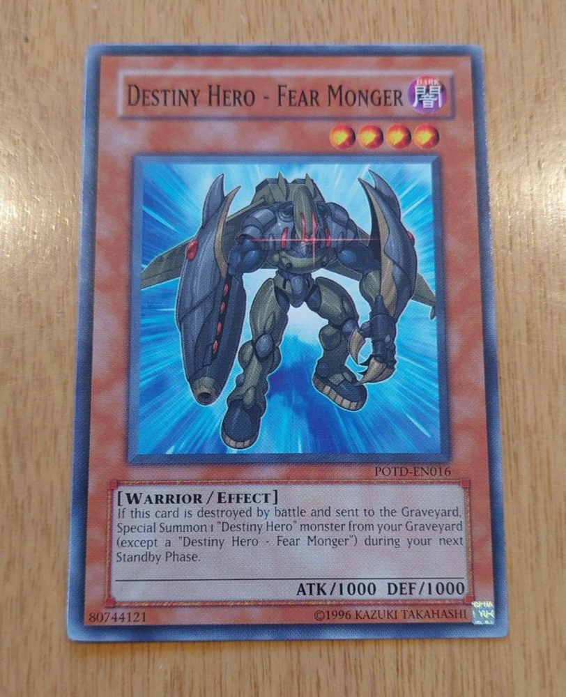 Hello, thank you so much for stopping by! Today, I am selling a Destiny Hero - Fear Monger POTD-EN016 Yu-Gi-Oh card. The card is in good shape, but is lightly Played, seeing minimal wear and tear with slightly worn edges, corners, some small surface scratches and buffs. See photos above for details. If you have any questions, please feel free to ask. I hope it was what you were looking for :)