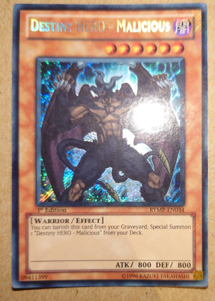 The Destiny Hero - Malicious RYMP-EN034 card is a highly sought-after Yu-Gi-Oh! collectable from the Ra Yellow Mega Pack set. Manufactured by Konami in 2012, this Secret Rare 1st Edition card features a Warrior-type creature and is in English. With its unique design and special features, this card is a valuable addition to any Yu-Gi-Oh! TCG collection, offering players a powerful effect to enhance their gameplay experience.