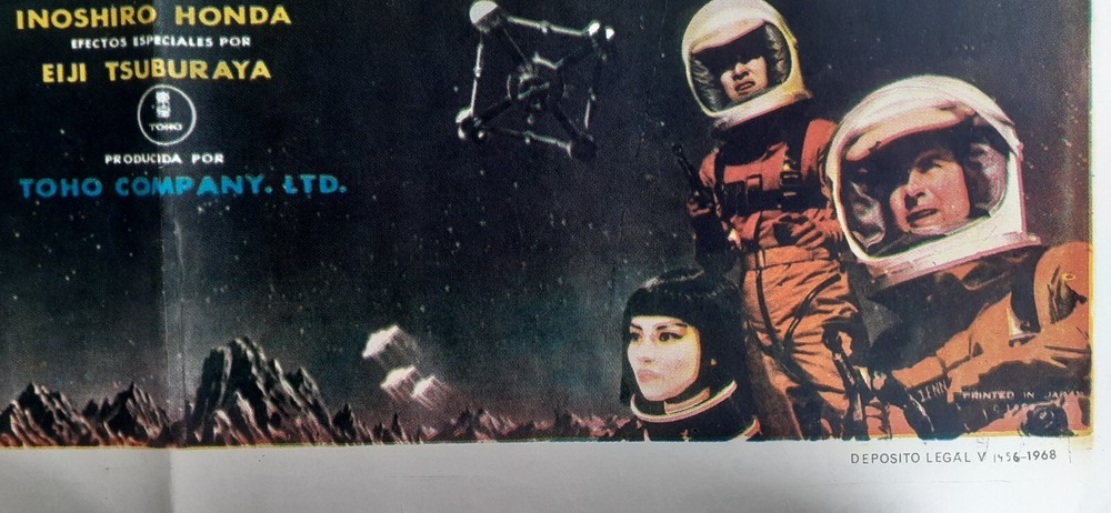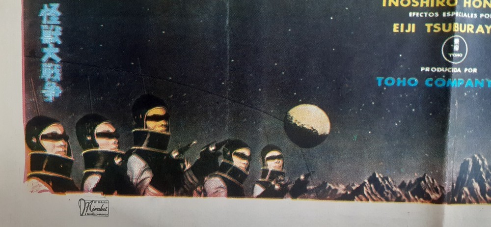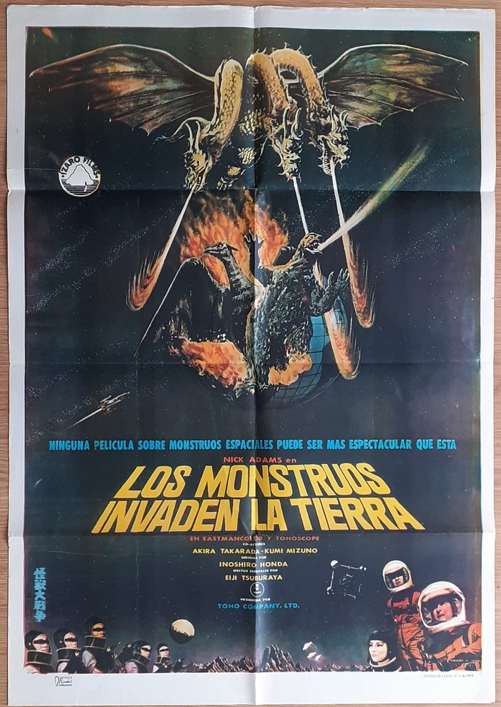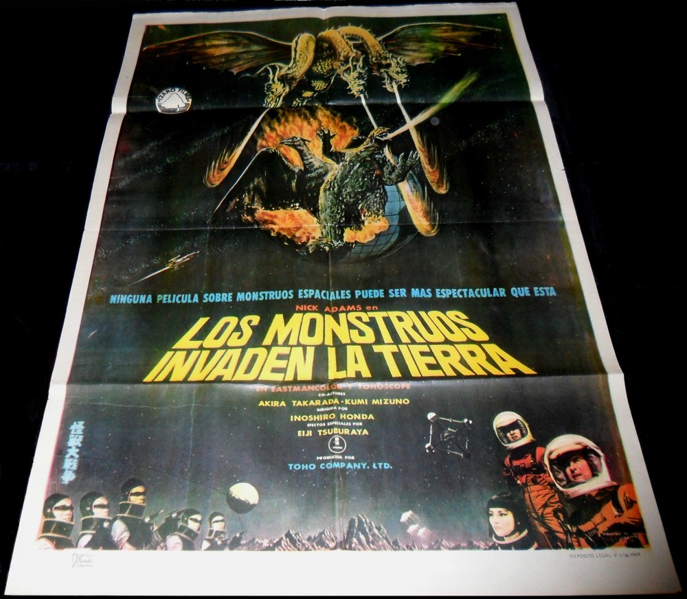 Kaijû sôshingeki aka: All Monsters Attack Destroy All Monsters [USA] Los Monstruos Invaden a Tierra (Spain) (1968) Directed by Ishiro Honda Description: Original Spanish 1968 Poster Condition: Fine Poster Year: 1968 Size: 39" x 27" (100 x 70 cm) Aprox. Comments: Original and Rare Spanish Poster. BRUTAL GIANT MONSTERS DESING Condition grading: All photos displayed are of the actual item for sale. For additional photos or information on the condition of any item, please email us at Mint A never used poster. May show minor signs of age and wear at folds due to storage. No holes, no tears. Near Mint A generally unused poster with fresh, saturated colors. May have minimal tears at folds. Has no significant holes, no paper loss, may have minor tears along edges, may have fine pin holes. Fine A poster with bright colors, clean, with general signs of use. May have minor tears at folds with minor paper loss, may have fine pin holes. May have restoration. Good An average poster with overall fresh color. May have tears, minor paper loss, minor hazing. Paper may be brittle due to age, may have minor stains. May have a small amount of writing in an unobtrusive place. May have medium or major restoration . Fair A poster with faded colors and brittle paper, showing significant signs of use. May have tears and paper loss. May have tape, writing, stains in image area. In need of restoration or had major restoration. Poor A poster that is worn, torn, and/ or damaged. May have staining, cracking, dry rot, and/or large tears. May be heavily soiled, may have pieces missing. In need of major restoration.