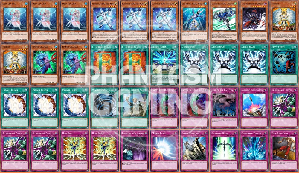 Deck Name: Diva Hero Beat (A) (Edison) # Main Deck (40) 3 - Deep Sea Diva 3 - Elemental HERO Neos Alius 1 - Elemental HERO Ocean 1 - Elemental HERO Stratos 1 - Gorz the Emissary of Darkness 2 - Honest 2 - Spined Gillman 2 - E - Emergency Call 1 - Future Fusion 3 - Gemini Spark 1 - Heavy Storm 3 - Miracle Fusion 1 - Mystical Space Typhoon 1 - Reinforcement of the Army 2 - Bottomless Trap Hole 1 - Call of the Haunted 1 - Compulsory Evacuation Device 3 - Dimensional Prison 1 - Dust Tornado 2 - Hero Blast 1 - Legacy of Yata-Garasu 1 - Mirror Force 1 - Solemn Judgment 1 - Torrential Tribute 1 - Trap Dustshoot You will receive all of the following cards listed above. Most cards will will be in near mint condition. In the case of certain older cards we will do our best but some cards may be light or even moderatly played in extreme condtions. Those conditions being the card has not been reprinted in a number of years and con no longer be easily purchased in light or near mint condition. Set, Rarity, and Edition will vary and cannot be special requested. These lists are constructed with least expensive rarities we have available in stock. All cards are play legal copies. Note: If purchasing a Yugioh Deck all Speed duel cards are 100% legal at all levels of play. Store Policies Here at PMG_LLC , we pride ourselves on having the best customer service around. If you have any questions or can't seem to find something that you want please do not hesitate to contact us. We will do our best to respond to all questions within one business day. Hours of Operation: Monday-Friday: 2:30pm - 10:00pm Saturday- 10:00am - 8:00pm Sunday 11:00am - 5:30pm Note: We are closed all national holidays. Info: Thank you for choosing PMG_LLC . We appreciate your business. We ship Monday through Friday to make sure you get your deck as quickly as possible. All orders priority orders can use combined shipping. In order to use the combined shipping your whole purchase needs to be checked out as one order. We ship once we have received your payment and payment has cleared. As always if you have any questions or concerns please feel free to contact us via email. Shipping Information: We ship Monday through Friday, barring national holidays during which the United States Postal Service is closed. If you purchase a card on Friday or Saturday please bear in mind it will not ship until Monday. US Shipping: First Class Mail : Free. Comes with tracking information. Priority Mail with Delivery Confirmation : $9.99 All orders are shipped in appropriate protective material inside bubble mailers. International Shipping: We do not offer international Shipping Return Policy: You must return items sold and fulfilled by PMG_LLC within 30 days of delivery to be eligible for a refund. Returns which are damaged in the mail due to improper return packaging will receive partial refunds. We will process a full refund for all items returned in their original condition. In order for us to process your full refund you must include the full name associated with the order as well as the eBay order number inside the return packaging. We will not process returns which do not include the buyer's name and order number. Requirements: Please return items with the original plastic packaging. Failure to do so may result in a partial refund. Also you must inform us of any returns you may wish to process before sending them back. Any items simply send back to us without prior contact will not be eligible for refunds. Important Notes Remember that to benefit from our domestic combined shipping on priority orders you must to pay in a single payment. If you place two separate priority orders you will be charged the $7.50 shipping fee for both orders. If you place multiple orders for Priority shipping you will be charged the corresponding shipping costs for each order, even if you place the orders on the same day. We do not refund shipping costs as we tend to package orders throughout the day and may not notice that you would otherwise have qualified for combined shipping. We want to provide you with 5 Star service and earn your Positive Feedback, so if for any reason you are not happy with your transaction, contact us before leaving feedback. Business Day - Our business day runs from Monday to Friday from 9am to 4pm, excluding US national holidays. Any orders placed or payments cleared less than 4 hours before the close of business will be considered orders from the following business day.
