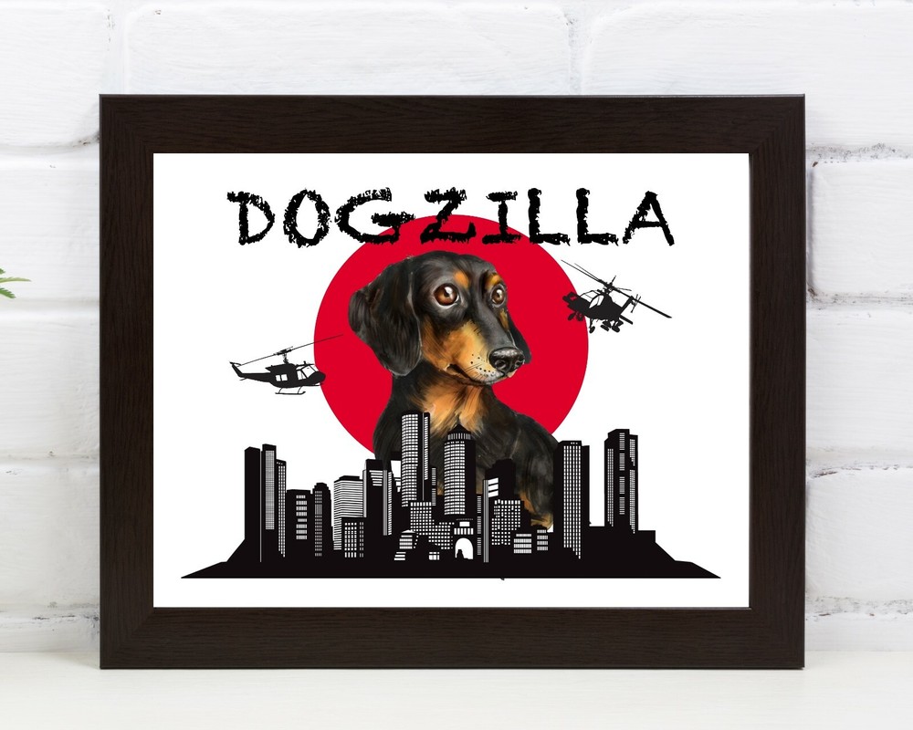 (other dogs available...just ask ) Dogzilla Dachshund Godzilla (or other dog) Wall Art Print UNFRAMED Dog Lover, Dog Mom Weiner Doxie Dog Printed with a Professional Printer on Premium Photo Paper. Measures approximately 8" x 10" and comes unframed so you can frame it the way that YOU want. Picture shows example of how it may looked framed. We absolutely love designing and printing art! Enjoy looking around and make sure to visit often because new art will be added often. Many other types of art prints are in the design stages and will be added to our store very soon!