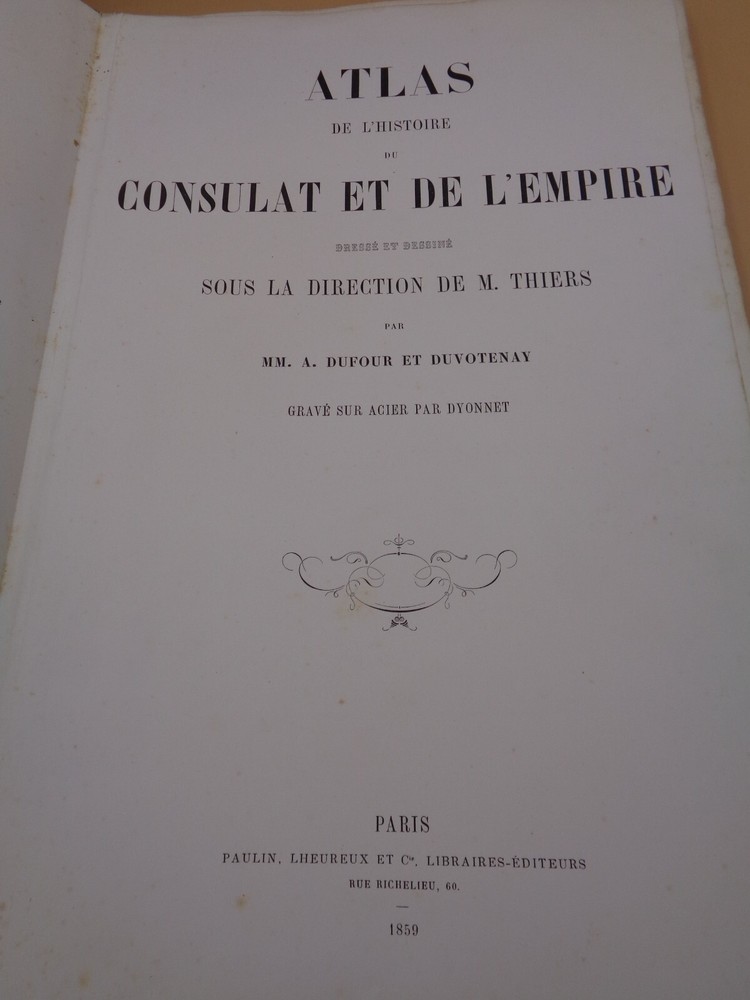 Dufour & Duvotenay Atlas of history of the Consulate and the Empire under the direction of Thiers Paris, 1859 Half buckram (43x30cm), 66 cards Binding in poor condition, some foxing Dufour & Duvotenay Atlas of history of the Consulate and the Empire under the direction of Thiers Paris, 1859 Half buckram (43x30cm), 66 cards Binding in poor condition, some foxing
