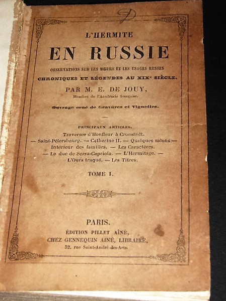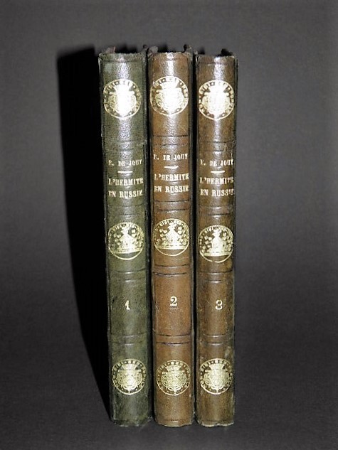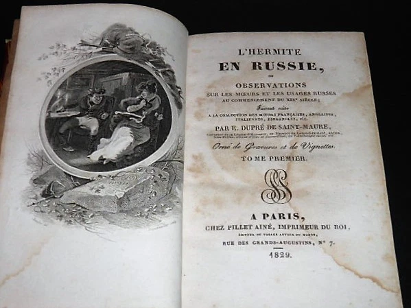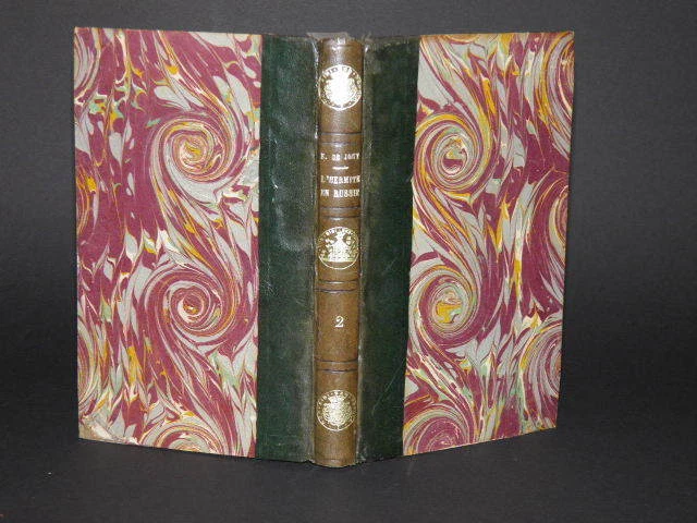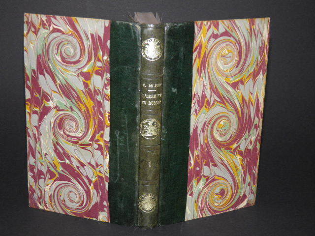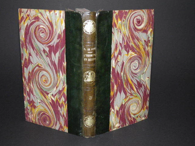 Please consult the conditions of sale at the end of the description before purchasing. DUPRE DE SAINT MAURE (Jean-Pierre Emile). The Hermit in Russia, or Observations on Russian customs and customs at the beginning of the 19th century; following the collection of French, English, Italian, Spanish customs, etc. Paris, Chez Pillet Ainé, 1829. 3 Volumes, COMPLETE. In-12 - 11x18cm. Binding signed Lasneret in green half-sheepskin , smooth back decorated with double cold fillets and golden fleurons with the arms of the counts of Falloux and Blois , speckled edges, preserved covers. XIX, 340pp; 2ff, 344pp, 1ff; 2ff, 308pp, 1ff. Illustrated copy of a frontispiece and a folding map. Work decorated with many figures. Fleurons and ex-libris arms of the counts of Falloux and Blois. Sunburned spines, foxing, significant but healthy wetting on the first 20 pages of volume 1, otherwise beautiful set. Theme: 19th century books; Books on HISTORY; Books on TRAVEL; What's new ___ Bookstore L’Art et la Manner 19 Route de Pithiviers 45300 BOYNES France Member of SLAM and LILA ( National Union of Ancient and Modern Bookstores / International League of Old Booksellers) ILAB (International League of Antiquarian Booksellers) English spoken Please don't hesitate to contact us if you have any inquiry The greatest care is taken in the description of the works, however, unintentional errors may be made. Do not hesitate to inform us, including after receipt of your purchase. Regarding shipping: The choice is yours! So that you can benefit from the best services and the most advantageous quality/price ratio, the bookstore offers you: Hand delivery by appointment, in Boynes, near Pithiviers, or in Paris on Saturday mornings or during old book fairs. Sending by the Post Office :: by letter for folds less than 3 cm thick (packaging included) or by colissimo. Deposit in Relay Point . The bookstore practices grouped shipments . If you make multiple purchases in our store, U A new claim for payment with adjusted postage costs will be sent to you within a maximum period of 24 hours . THE insurance is optional (option not available for Relay Point shipments). For shipments to Overseas , please contact us beforehand to find out the exact amount of postal costs. Although packaging costs are offered, packages are reinforced and prepared with great care. The Librairie l'Art et la Manière is always on the lookout for rare and old works, to purchase individually or in batches. We travel primarily in Loiret (45), Paris (75) and the south of Ile-de-France (91, 77, 78, 92, 94) as well as in Yonne (89) and Eure-et-Loir (28). If you would like to sell some, do not hesitate to contact us. Just type “Librairie l’Art et la Manière” into your favorite search engine! DUPRE DE SAINT MAURE (Jean-Pierre Emile). The Hermit in Russia, or Observations on Russian customs and customs at the beginning of the 19th century; following the collection of French, English, Italian, Spanish customs, etc. Binding signed Lasneret in green half-sheepskin, smooth back decorated with double cold fillets and golden fleurons with the arms of the counts of Falloux and Blois, speckled edges, preserved covers. The bookstore practices grouped shipments. If you make multiple purchases in our store, UA new claim for payment with adjusted postage costs will be sent to youwithin a maximum period of 24 hours. The Librairie l'Art et la Manière is always on the lookout for rare and old works, to purchase individually or in batches. We travel primarily in Loiret (45), Paris (75) an