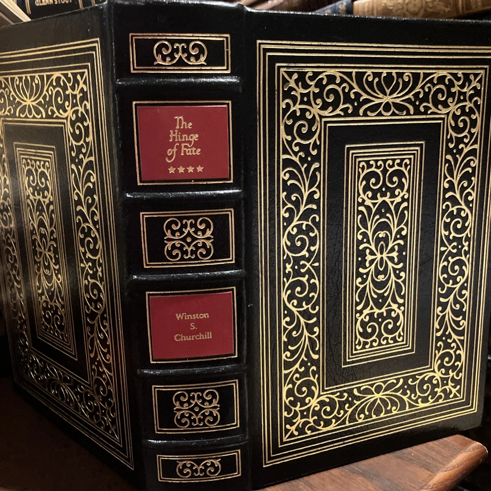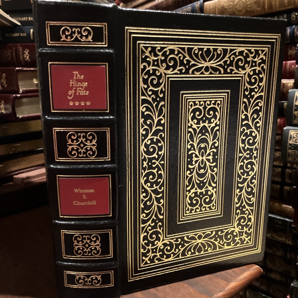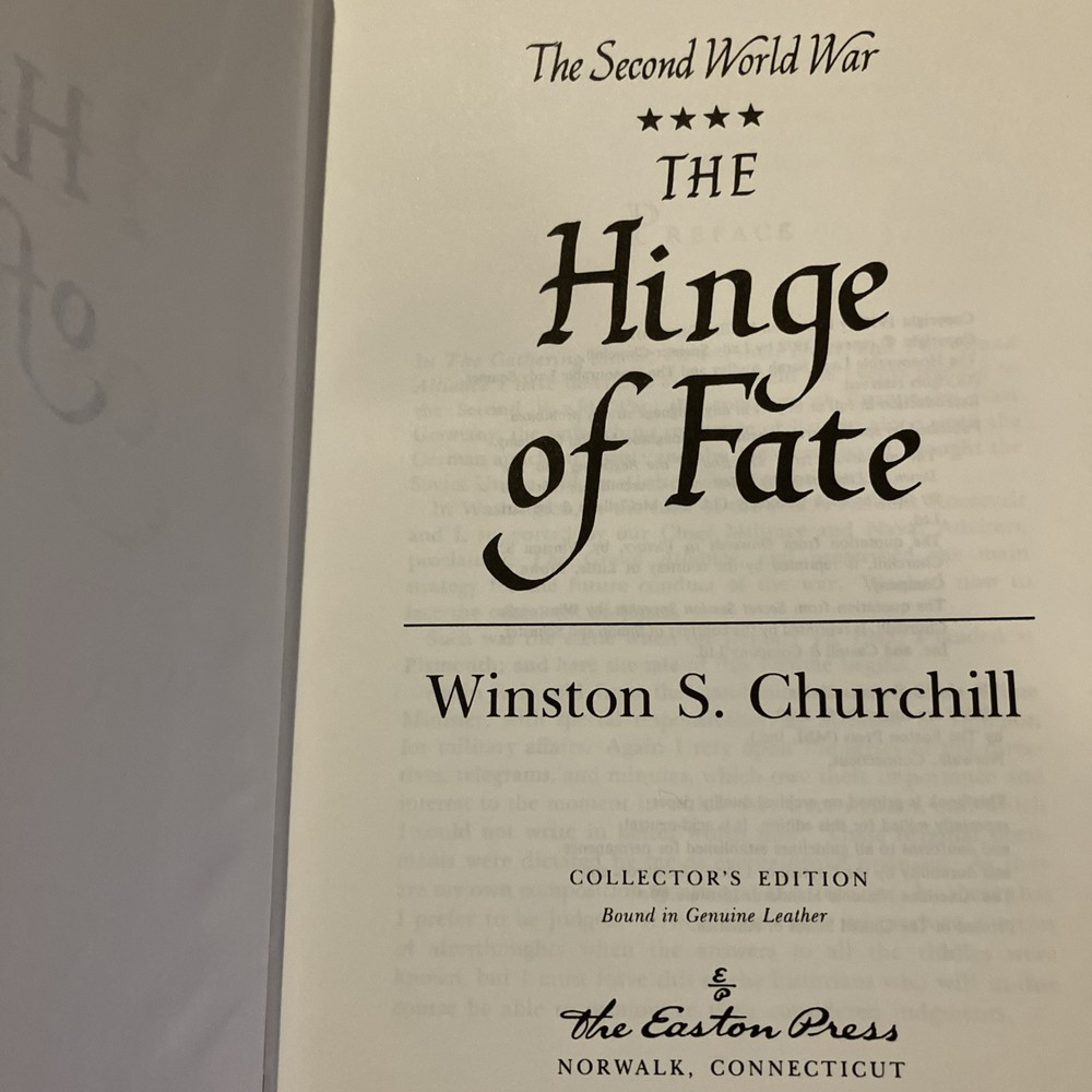 Easton Press leather edition of Winston Churchill's "The Hinge of Fate," a COLLECTOR'S edition, Illustrated with Maps, published in 1989. Bound in deep hunter green leather, the book has camel tan French moire silk end leaves, satin book marker, Symth-sewn binding, printed on archival, acid-free paper, hubbed spine, gold gilding on three edges---in near FINE condition. Sir Winston Leonard Spencer Churchill, who lived from 1874--1965, was the eldest son of Lord Randolph Churchill, the seventh duke of Marlborough. Churchill served in the army in 1895 in Cuba, India, Tirah and Egypt. He was undersecretary for the colonies, 1906-08, first lord of the Admiralty, 1911-1915; secretary of war, 1918-21; and chancellor of the exchequer 1924-29; and prime minister, 1940-45 and 1951-55. "I expect that the Battle of Britain is about to begin," declared Winston Churchill in June 1940. "Upon this battle depends the survival of Christian civilization. . . .Hitler knows that he will have to break us in this island or lose the war. . . Let us therefore brace ourselves to our duties, and so bear ourselves that, if the British Empire and its Commonwealth last for a thousand years, men will say, 'This was their finest hour.' Churchill wrote: "The new year of the Second World War, 1942, opened upon us in an entirely different shape for Britain. We were no longer alone. At our side stood two mighty Allies. Russia and the United States were engaged to fight to the death in the closet concert with the British Empire." In the Preface, Churchill wrote: "In 1942, President FRANKLIN ROOSEVELT and I, supported by our Chief Military and Naval Advisers, proclaimed THE GRAND ALLIANCE, and prescribed the main strategy for the future conduct of the war. We had now to face the onslaught of Japan." The Japanese had overrun the whole of Malays except Jahore. Pride and patriotism are evident in Churchill's dramatic account. Having learned a lesson at Munich that they would never forget, the British refused to make peace with Adolph Hitler, defying him even after France had fallen and after it seemed as though the Nazis were unstoppable. Churchill remained unbowed throughout, as did the people of Britain. Strategies were developed to respond to Hitler's ruthless conquest of Europe, his planned invasion of England, and his treacherous assault on Russia. Germany, Italy and Japan continued pressing forward with their terrible onslaught. The Grand Alliance eventually overwhelmed the Red Army and Rommel in the war in the desert and Singapore which fell to Japan. Victories at Midway and Guadalcanal boosted confidence. A few of the Chapter titles include: "Australian Anxieties," "The Setback in the Desert," "Penalties in Malaya," "A Vote of Confidence," "Cabinet Changes," "The Fall of Singapore," "The U-Boat Paradise," "The Loss of the Dutch East Indies," "The invasion of Burma," "Ceylon and the Bay of Bengal," "The Shipping Stranglehold," "India---the Cripps Mission," "My Journey to Cairo," "The Molotow Visit," "American Naval Victories: The Coral Sea and Midway Island," "Malta and the Desert," "Moscow: A Relationship Established," "The Casablanca Conference," "Russia and the Western Allies," "Victory in Tunis," "My Third Visit to Washington," "Italy the Goal," "Problems of War and Peace." Some of the personalities of the period included: Clement Attlee, General Auschinleck, Harold Alexander, Rommel, Lord Beaverbrook, Alan Brooke, Alexander Cadogan, Winston Churchill, Mark Clark, Admiral Darlan, Charles De Gaulle, Dwight Eisenhower, Antony Eden, George VI, General Giaud, Adolph Hitler, Harry Hopkins, Hastings Ismay, Ernest King, Lord Frederick Leathers, General George Marshall, General Bernard Montgomery, Vyacheslav Molotov, Admiral Lord Louis Mountbatten, Benito Mussolini, General Percival, General George S. Patton, Admiral Pound, Joseph Stalin, General Joseph Stilwell, Marshall Wavell, Admiral Yomamoto, and General Weygand. "Hinge of Fate" is the fourth Churchill book about World War 2. Churchill said he named this volume such because in it we turn from almost uninterrupted disaster to almost unbroken success. For the first six months of this story all went ill; for the last six months everything went well. And this agreeable change continued to the end of the struggle." Winston Churchill was awarded the NOBEL PRIZE in 1953----and this work was one that was cited! 1000 pages, including Appendix, and an index. I offer combine d shipping.